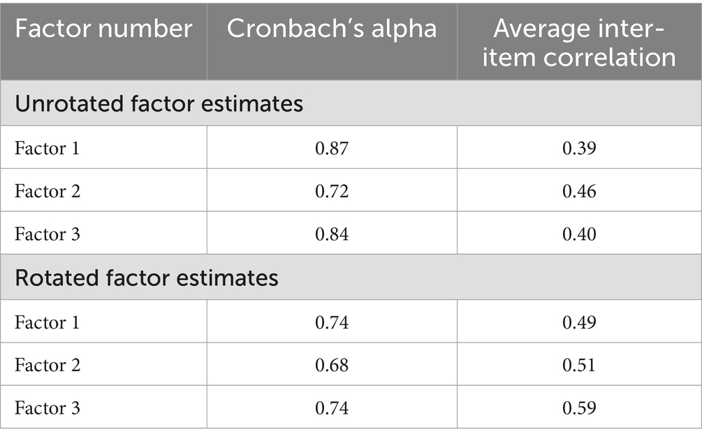 We also measured the reliability of each factor using Cronbach’s alpha. All three factors exhibited strong reliability scores ranging from 0.72–0.87 for unrotated factors and 0.68–0.74 for rotated factors and strong average inter-item correlation coefficients ranging from 0.39–0.46 (unrotated) and 0.49–0.59 (rotated) (see Table 8).