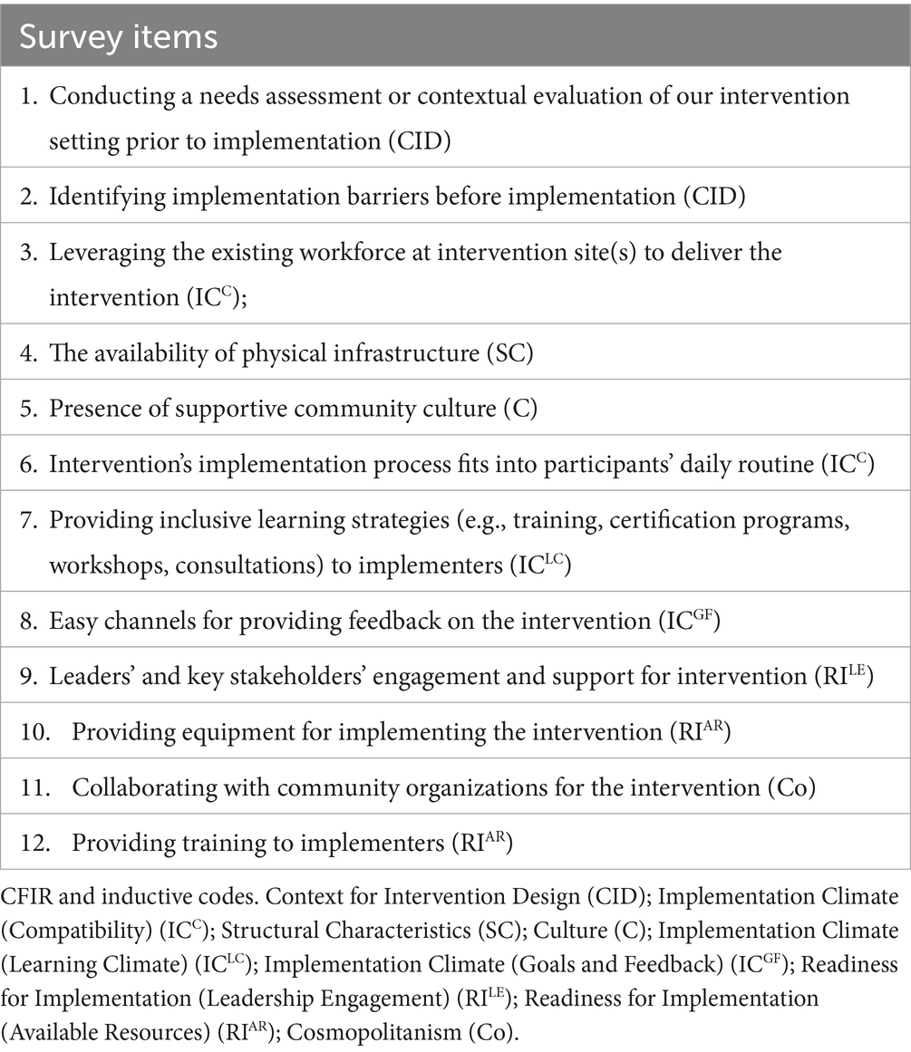 Table 2. The final list of survey items (n = 17) from the Delphi-method item rating exercise, labeled with their corresponding CFIR or inductive codes.