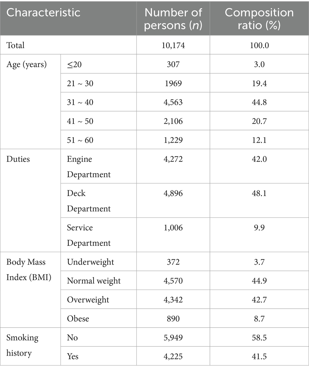 This study focused on the Chinese professional seafarer population, encompassing both Yangtze River inland seafarers and ocean-going seafarers. All participants were required to undergo mandatory occupational health examinations at medical institutions designated by the Maritime Safety Administration of China after completing the statutory disembarkation procedures. No restrictions were imposed on the participants’ places of origin; their transportation methods (such as public transport, private vehicles, etc.) and related expenses were borne by individuals themselves. The examinations were initiated after seafarers had completed their voyage tasks and formally disembarked. These examinations might be conducted on the day of disembarkation or within the subsequent rest days, rather than being compulsorily limited to the first 24 h after disembarkation, ensuring that the seafarers’ physical conditions were in a relatively basal state. All Chinese seafarers underwent identical nationally standardized examinations (GB 30035–2013). Foreign seafarers follow flag state-nationality agreements; none were examined at our institution. However, most of included Chinese seafarers served international routes (Trans-Pacific, Asia-Europe, Southeast Asia trunk lines), whose occupational exposure profiles encompass global shipping risks, ensuring cross-cultural generalizability. Epidemiological data indicate that female seafarers globally constitute only 1% of the maritime workforce, with a further reduced proportion in deep-sea positions (predominantly concentrated in service-support roles). Based on the principles of population representativeness and requirements for homogeneity of exposure, this study has enrolled 10,174 Chinese male seafarers who underwent physical examinations at Yangtze River Shipping General Hospital between January and December 2024 as research participants. The core indicators required for this study (such as gender, age, BMI, etc.) are all mandatory items. Their physical examination data are accompanied by corresponding serial numbers and original records. During research data entry, logical consistency checks were conducted on relevant indicators using SPSS 26.0 to eliminate entry errors. The inclusion criteria for study participants were as follows: (i) Age: 18–60 years (encompassing the active seafaring workforce); (ii) Complete dataset: Anthropometric (height, weight), clinical (blood pressure), and laboratory measures; (iii) Chinese nationality with registration in mainland China’s maritime authorities (excluding Hong Kong, Macao, and Taiwan); (iv) Primary occupation: Maritime transport employment (≥50% annual income). Participants meeting all criteria were enrolled; others were excluded.