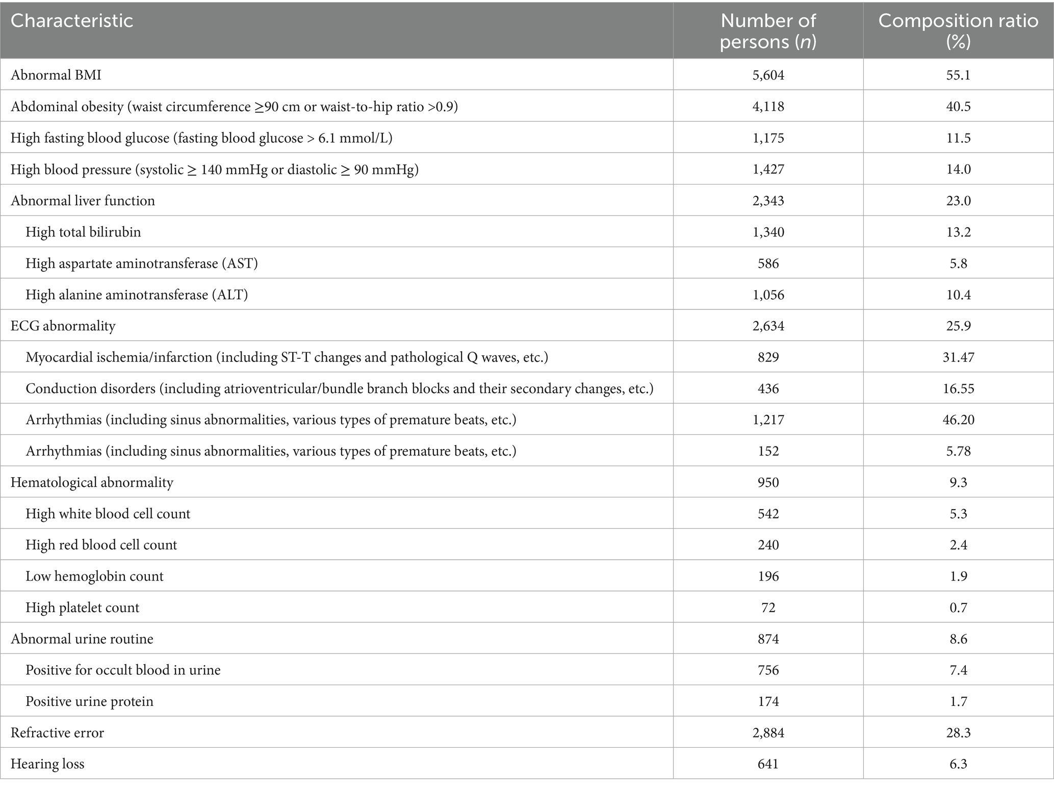 A total of 10,174 subjects were included in this study, all of them were male, the age distribution was mainly 21–30 years old and 31–40 years old, and the distribution of job types was mainly on deck and in the engine post, as shown in Table 1. The common abnormal results of seafarers’ health checkups were: BMI abnormality, abdominal obesity, refractive error, liver function abnormality, ECG abnormality, high blood pressure and high fasting blood glucose. Abnormal ECG findings in seafarers are mainly characterized by myocardial ischemia/infarction (accounting for 31.47%) and arrhythmias (accounting for 46.20%), with details presented in Table 2.
