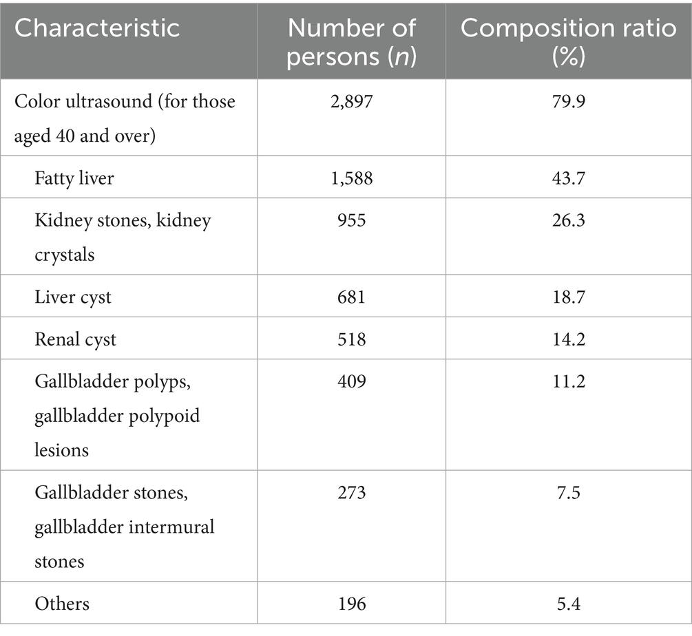 In this study, a total of 3,628 seafarers over 40 years of age underwent ultrasound examination of the liver, gallbladder, pancreas, spleen and kidneys, and a total of 2,897 (79.9%) had abnormal ultrasound results. Among them, fatty liver and urinary stones were more common, and multiple ultrasound abnormalities could exist at the same time, as shown in Table 3.