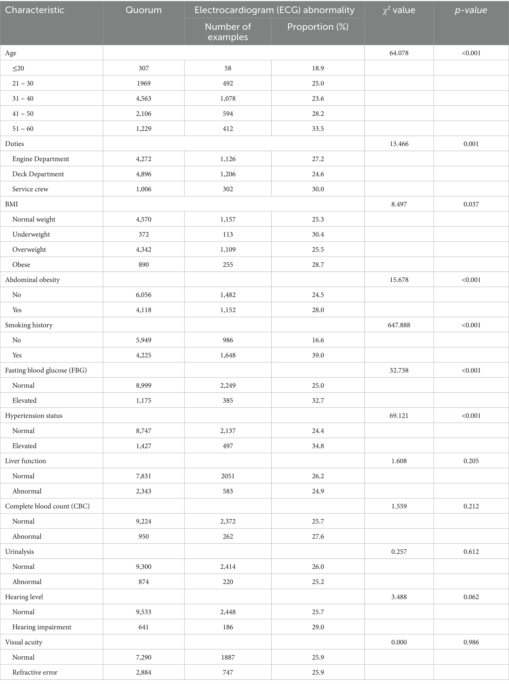 Methods: 10,174 seafarers who underwent health checkups at the Yangtze River Shipping General Hospital from January 2024 to December 2024 were selected as the survey subjects, and clinical data such as their general conditions, ECG and other functional examinations, and biochemical indicators were extracted. SPSS 26.0 software was used for statistical analysis to understand the disease composition of seafarers’ health checkups, and single-factor analysis and multifactor logistic regression analysis were used to explore the influencing factors of seafarers’ abnormal ECG results.