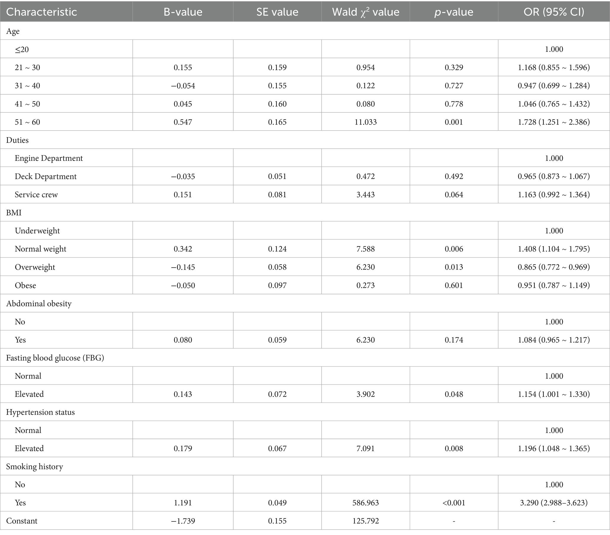 A multivariable logistic regression analysis was performed with the dependent variable of whether the ECG results were abnormal, and the independent variables of age, job title, BMI and other factors that were statistically significant (p < 0.05) in the univariate analysis were included as independent variables. Multivariate logistic regression analysis revealed that elevated fasting blood glucose (OR = 1.154, 95% CI: 1.001–1.330, p < 0.05), elevated blood pressure (OR = 1.196, 95% CI: 1.048–1.365, p < 0.05), and smoking (OR = 3.290, 95% CI: 2.988–3.623, p < 0.05) were all independent risk factors for ECG abnormalities in seafarers’ physical examinations, with details presented in Table 5.