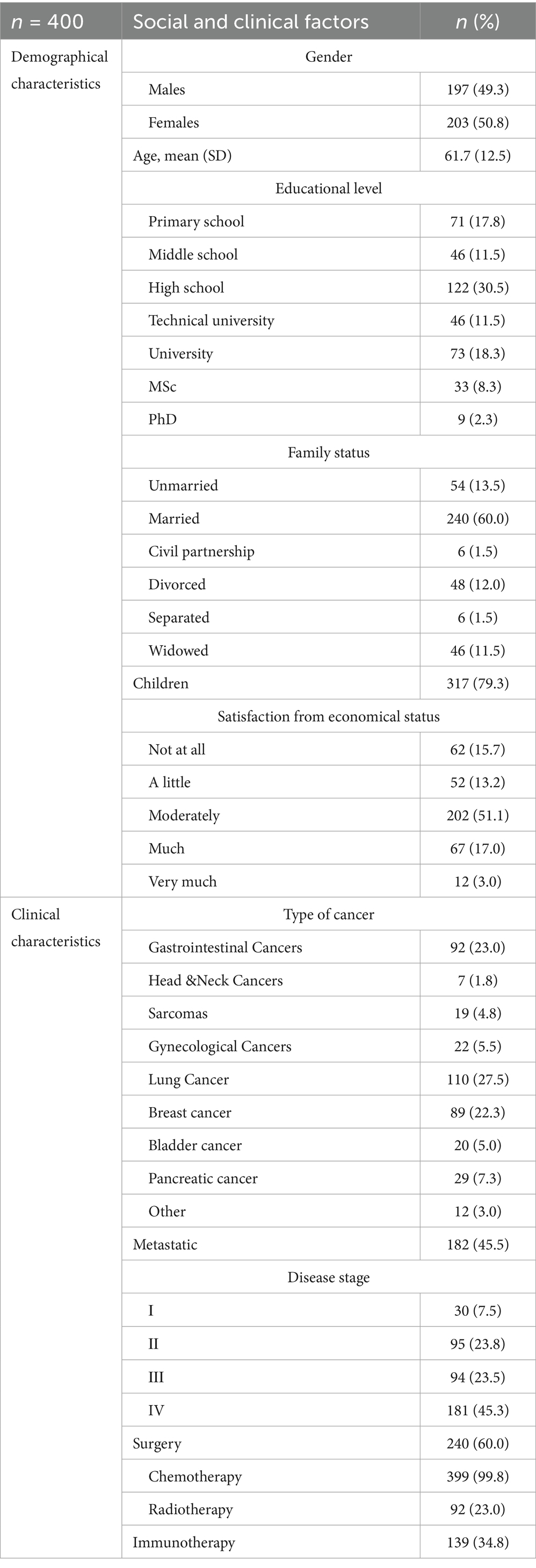 Four hundred cancer patients participated in the study, with mean age being 61.7 years (SD = 12.5 years). Their characteristics are presented in Table 1. Most patients were females (50.8%), high school graduates (30.5%), married (60.0%), with children (79.3%) and moderately satisfied from their economic status (51.1%). Moreover, 27.5% had been diagnosed with lung cancer and 23% with gastrointestinal Cancer. Metastatic cancer had 45.5% of the sample and 45.3% had stage IV diagnosis.