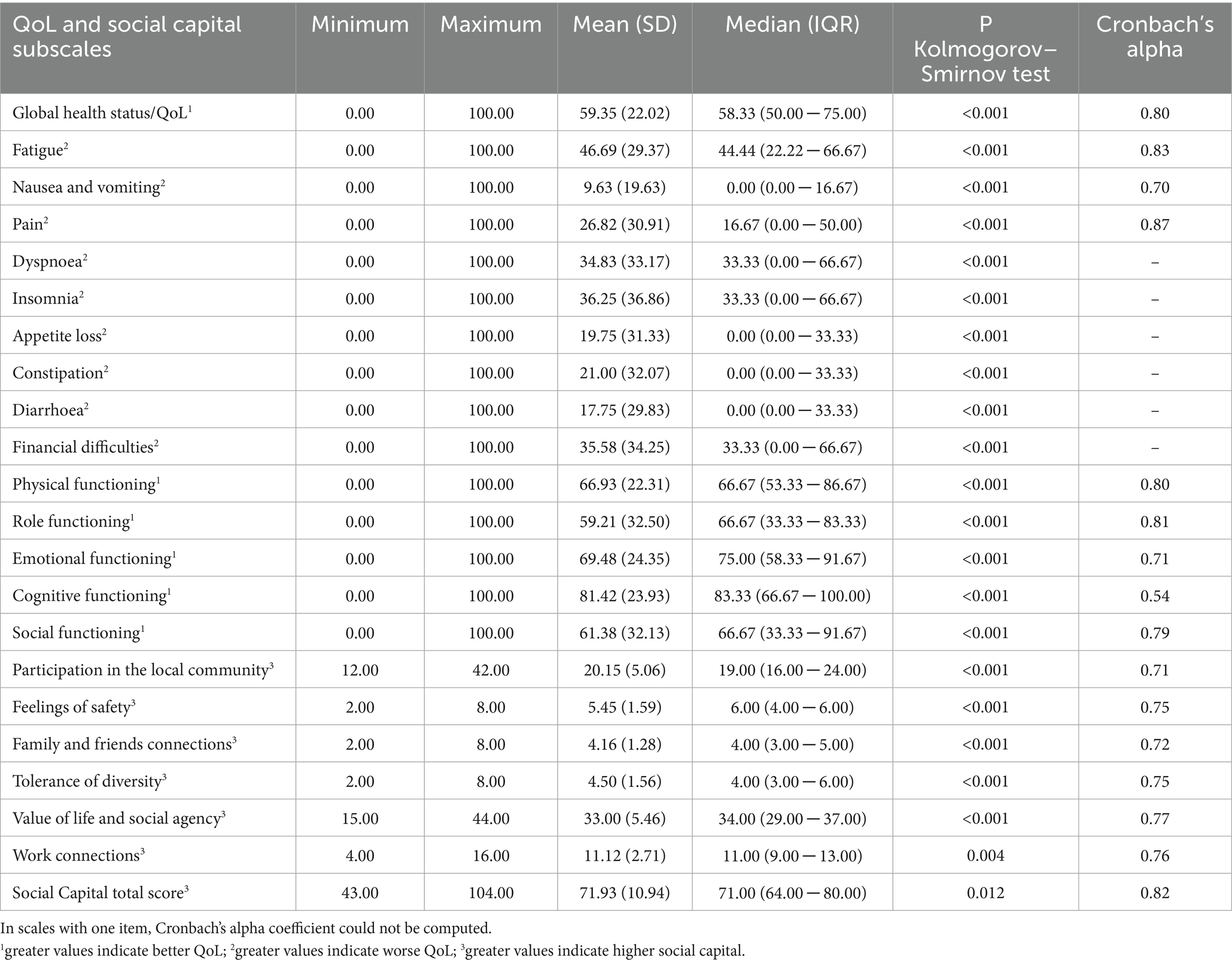 The Kolmogorov–Smirnov test was used to check the normality distribution of the quantitative variables. Since the assumption of normality was not satisfied for all under study scales, non-parametric tests or specific transformations were used for their analysis. Quantitative variables were expressed as mean values (Standard Deviation) and as median (interquartile range), while categorical variables were expressed as absolute and relative frequencies. The association between QoL and Social capital scales was checked via Spearman correlations coefficients (rho). The coefficient is considered very high when it is above 0.9, high when it is 0.7–0.9, moderate when it is 0.5–0.7, low when it is 0.3–0.5 and very low when it is below 0.3 (33). The associations between QoL and Social capital scales were also examined, after adjusting for all patients’ characteristics, via multiple linear regression analysis with dependent variables the QoL subscales. The regression equation included terms for patients’ demo-graphical and clinical characteristics, as well as their scores in Social capital scale one at a time, due to high intercorrelation. Adjusted regression coefficients (β) with standard errors (SE) were computed from the results of the linear regression analyses. Logarithmic transformations of the QoL scales were used for the regression analyses. Internal consistency reliability was determined by the calculation of Cronbach’s alpha coefficient. Scales with reliabilities equal to or greater than 0.70 were considered acceptable. Missing data were handled by listwise deletion in the analysis. All reported p values are two-tailed. Statistical significance was set at p < 0.05 and analyses were conducted using SPSS statistical software (version 27.0).