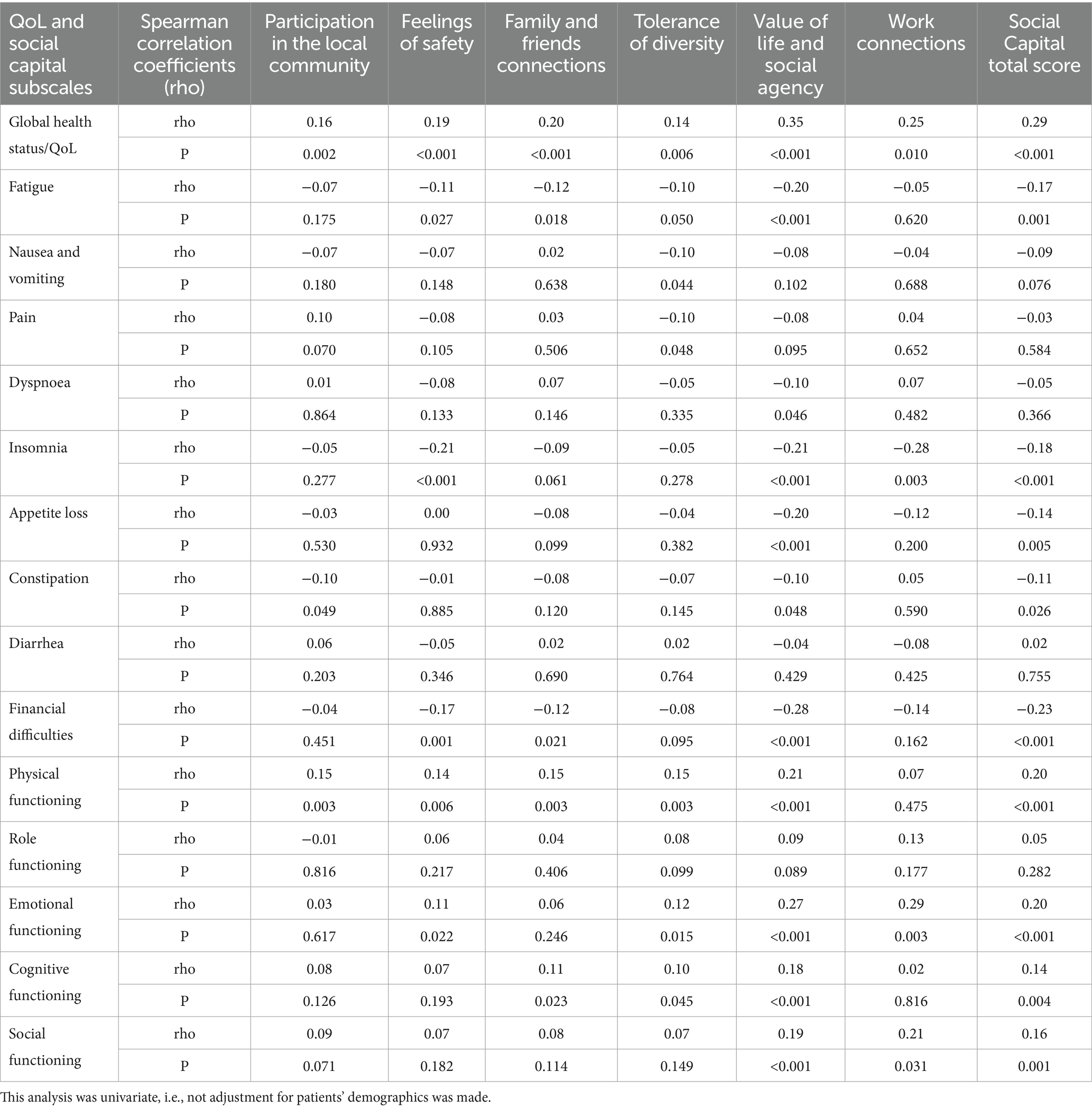 Results: Greater total score in Social capital scale was significantly associated with greater overall QoL (β = 0.005; p < 0.001), better Emotional functioning (β = 0.004; p = 0.004) and better Social functioning (β = 0.009; p = 0.002),with lower Nausea and vomiting (β = −0.017; p = 0.015), Insomnia (β = −0.014; p = 0.002), Appetite loss (β = −0.010; p = 0.018) and Constipation symptoms (β = −0.009; p = 0.047).