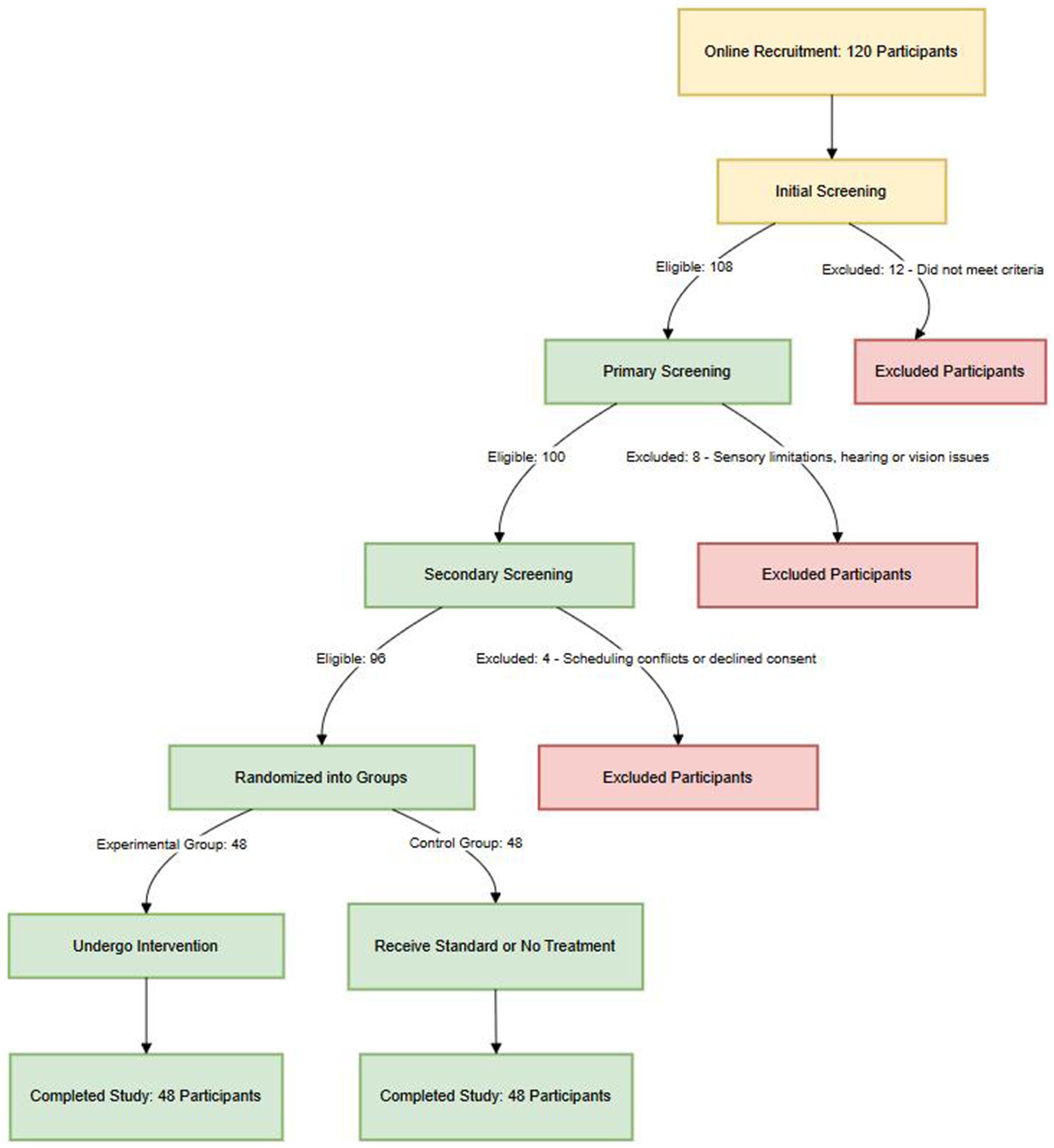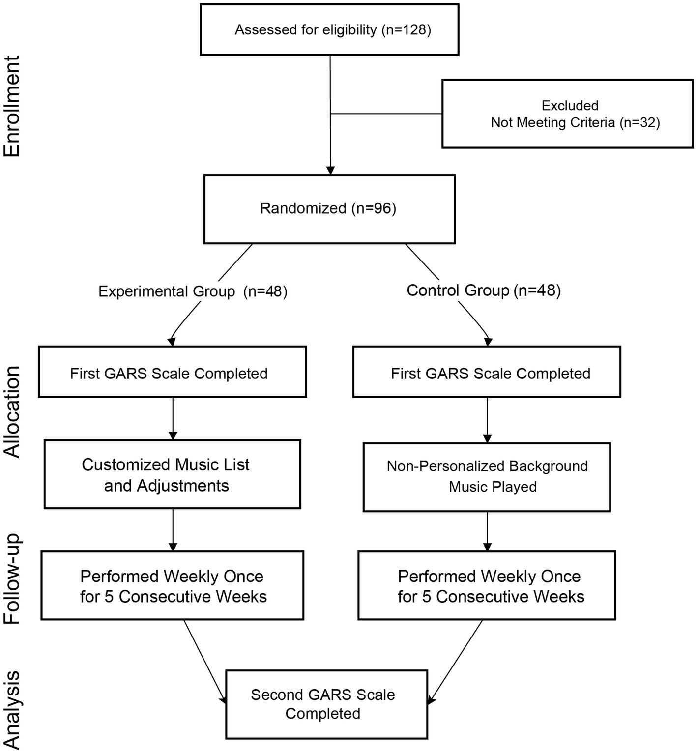 Participants were randomly assigned to the experimental or control group. The control group received a placebo intervention consisting of weekly exposure to non-personalized background music, such as standardized piano pieces or natural ambient sounds with consistent tempo and minimal emotional variation (Supplementary Table S1), followed by 30 min of low-intensity physical activity. Exercises included neck rolls, shoulder rotations, lateral trunk bends, leg stretches, and simplified standing balance movements. These activities emphasized flexibility and gentle movement, with heart rate maintained below 50 percent of the estimated maximum. All sessions were supervised by trained assistants.