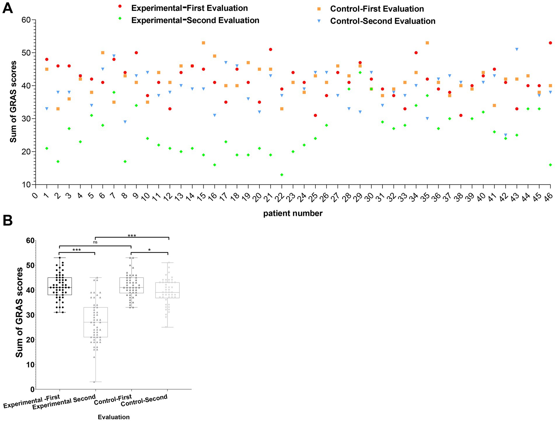 Figure 3. Visualization of changes in work-related stress among participants before and after resource-oriented music-based interventions. (A) Scatterplot of GARS scores for experimental (n = 46) and control groups (n = 46) recorded during the first and second evaluations. Red and green dots represent the first and second evaluations for the experimental group, respectively, while orange squares and blue triangles represent the first and second evaluations for the control group. (B) Box plot comparing GARS scores between groups before and after the intervention. Four categories are depicted: first and second evaluations for both the experimental and control groups. Statistical comparisons were conducted using independent sample t-tests, with significance levels indicated as *p < 0.05, **p < 0.01, and ***p < 0.001.