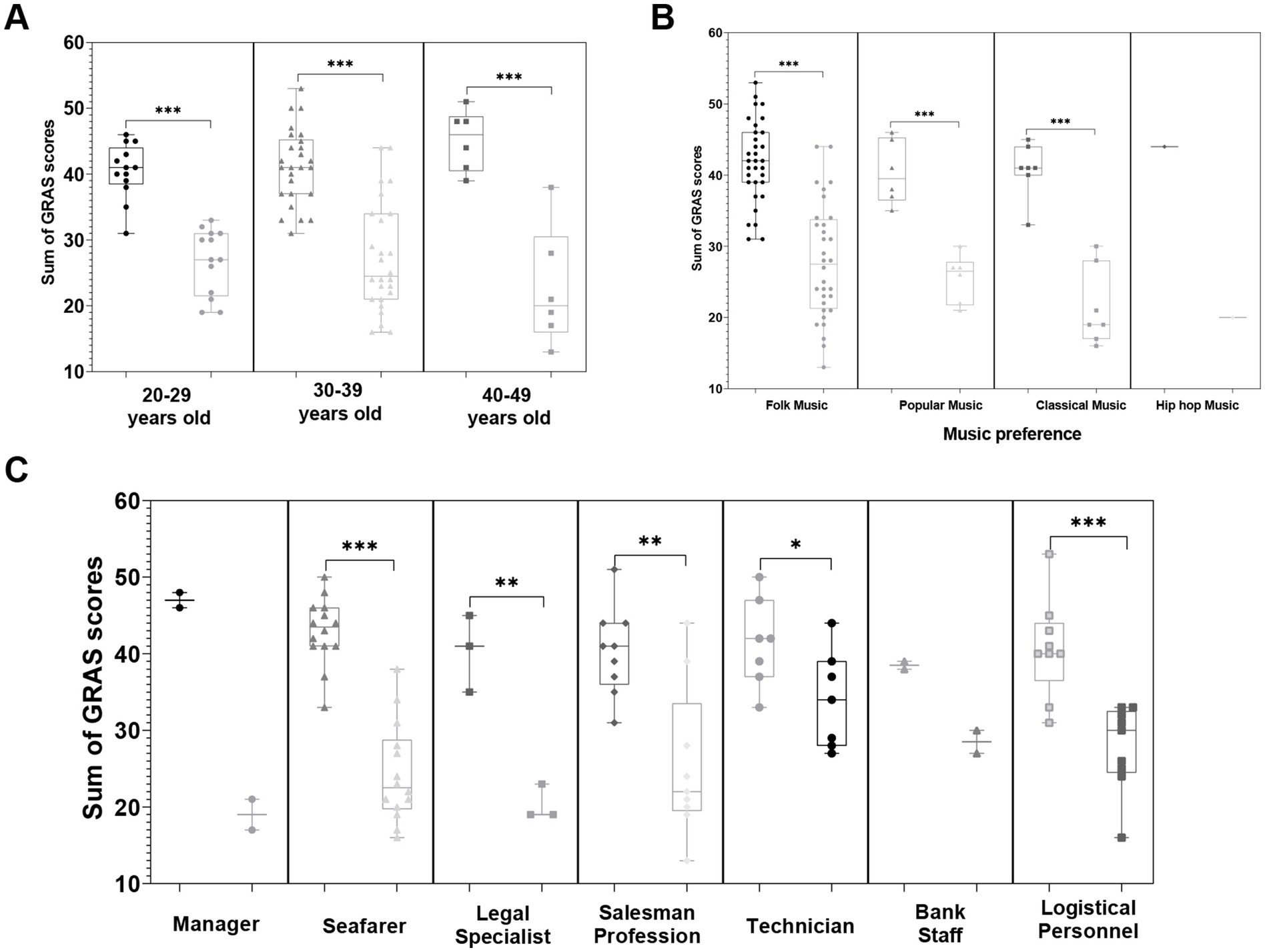Figure 4. Impact of resource-oriented music therapy interventions on stress reduction across different age groups, music preferences, and occupational categories. (A) Violin plot illustrating stress reduction across age groups, with participants aged 40–49 showing the most significant improvement. (B) Grouped scatterplot highlighting stress relief effects based on music preferences, with participants preferring classical music demonstrating the most notable benefits. (C) The bar chart shows changes in stress across different occupational categories, with seafarers experiencing the most significant improvement in stress *p < 0.05, **p < 0.01, and ***p < 0.001.