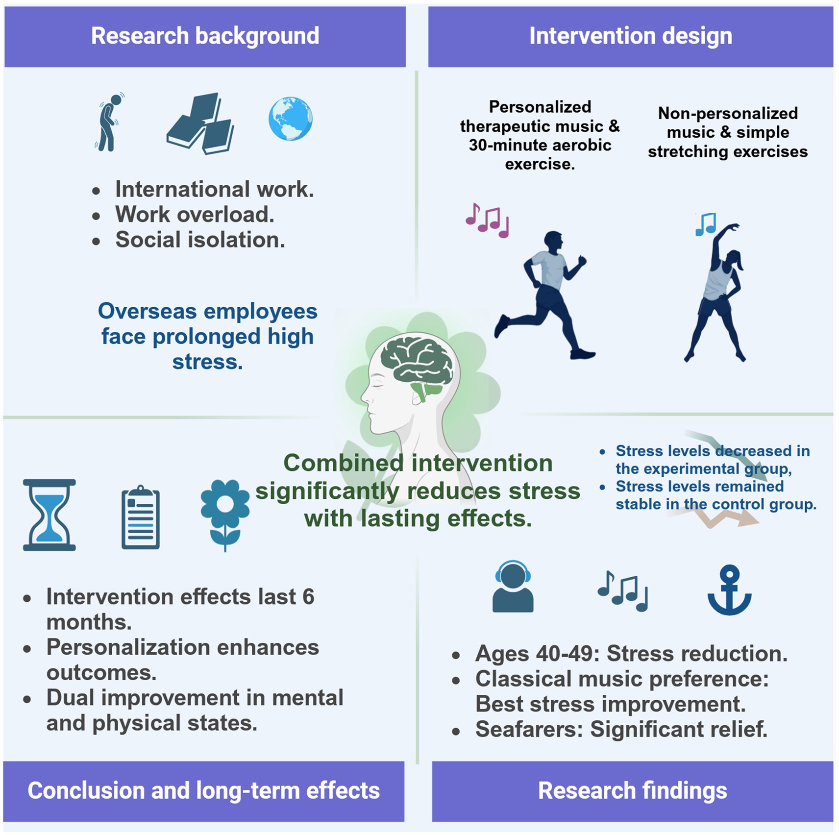 While the intervention effects observed in this study are consistent with previous findings, the design and outcomes offer several novel contributions. First, to our knowledge, this is the first randomized trial to evaluate the combined effects of music-based and moderate-intensity aerobic exercise interventions specifically targeting stress reduction in overseas employees—a population facing unique stressors related to cultural adaptation, occupational demands, and social isolation. Second, the study systematically examined the moderating roles of personalized factors such as age, occupational category, and music preference, offering theoretical support for tailored intervention design. Third, the six-month follow-up extended the time frame of evaluation beyond the short-term focus of most existing studies, providing insights into the sustainability of the intervention.
