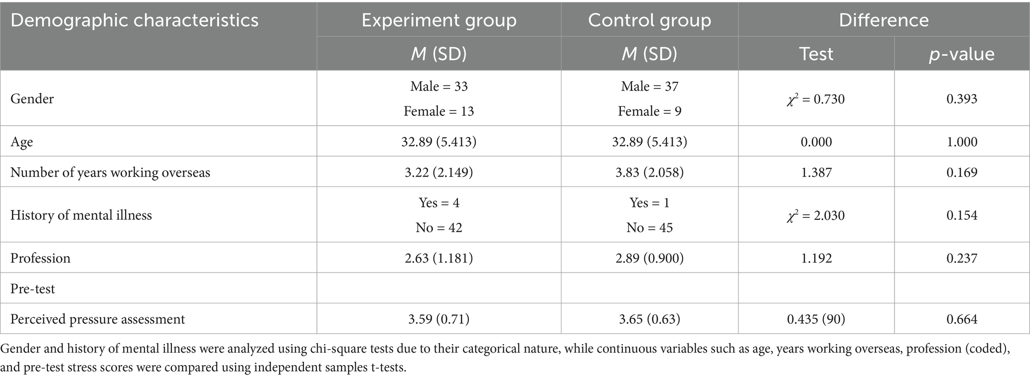 Table 1 presents the experimental and control groups’ baseline demographic characteristics and pre-intervention stress levels. In the experimental group, there were 33 males and 13 females, while the control group included 37 males and 9 females. The difference in gender distribution between groups was not statistically significant (χ2 = 0.73, p = 0.393). The mean age was identical across groups at 32.89 years (SD = 5.413) (t = 0.000, p = 1.000). The mean occupational code was 2.63 in the experimental group and 2.89 in the control group. Average years of overseas work experience were 3.22 for the experimental group and 3.83 for the control group. These differences were not statistically significant (p > 0.05). Regarding history of mental illness, 4 participants in the experimental group and 1 participant in the control group reported having a history. The between-group difference was not statistically significant (χ2 = 2.030, p = 0.154). Pre-intervention stress levels, as measured by the Global Assessment of Recent Stress (GARS), showed a mean score of 3.59 (SD = 0.71) in the experimental group and 3.65 (SD = 0.63) in the control group (t = 0.435, p = 0.664). The experimental group comprised 72% male participants, and the control group had 80% male participants. Regarding occupational composition, 42.4% of participants were in technical roles and 35.9% in project management positions.
