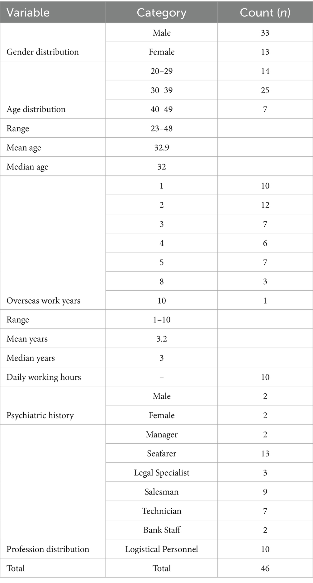 Occupational categories included 2 managers, 13 seafarers, 3 legal professionals, 9 sales staff, 7 technicians, 2 bank employees, and 10 logistics and customer service personnel. Four participants (2 male and 2 female) reported a history of mental health conditions, including anxiety and depression. The average reported working hours per day was 10 h.