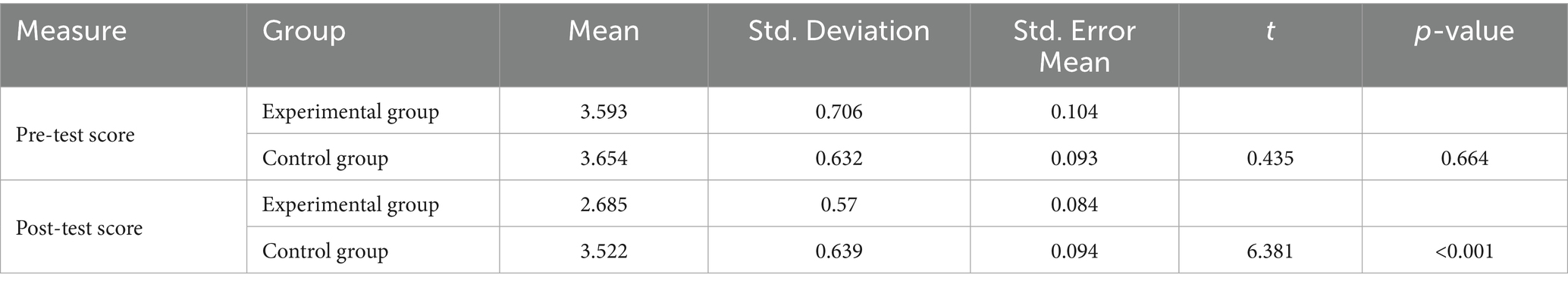 This study collected and analyzed Global Assessment of Recent Stress (GARS) scores before and after the intervention. The experimental group had a mean pre-intervention score of 3.59 (SD = 0.71), which decreased to 2.68 (SD = 0.57) after the intervention. The control group’s pre-intervention mean score was 3.65 (SD = 0.63), and the post-intervention score was 3.52 (SD = 0.64). Independent-sample t-tests showed a statistically significant difference between the post-intervention scores of the two groups (t = −6.633, p < 0.001), with a partial η2 of 0.328, indicating a moderate effect size (Table 3).