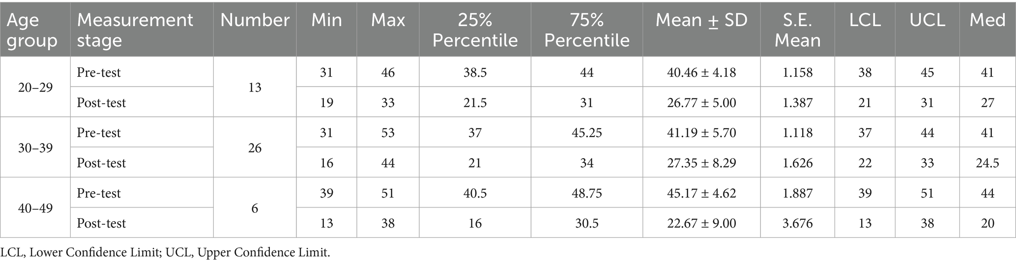 Participants aged 40–49 showed the largest reduction in stress levels. The mean GARS score for this group decreased from 45.17 (SD = 4.62) before the intervention to 22.67 (SD = 9.00) after the intervention, with the median score decreasing from 44 to 20. The 20–29 age group showed a reduction from 40.46 (SD = 4.18) to 26.77 (SD = 5.00), and the 30–39 age group showed a decrease from 41.19 (SD = 5.70) to 27.35 (SD = 8.29). Figure 4B presents the distribution of stress scores across age groups. The 40–49 group demonstrated a visible narrowing of score variability, with most post-intervention scores concentrated in the lower range.