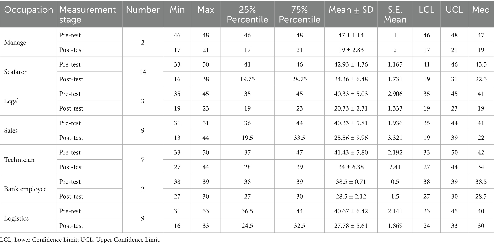Seafarers showed the greatest reduction in stress levels, with mean GARS scores decreasing from 42.93 (SD = 4.36) before the intervention to 24.36 (SD = 6.48) after the intervention. The median score declined from 43.5 to 22.5. Managers showed a reduction from 47 (SD = 1.14) to 19 (SD = 2.83), sales staff from 40.33 (SD = 5.81) to 25.56 (SD = 9.96), and technicians from 41.43 (SD = 5.80) to 34 (SD = 6.38). Bank employees had the smallest change, decreasing scores from 38.5 (SD = 0.71) to 28.5 (SD = 2.12). Figure 4A visually represents the changes in stress scores across different occupational categories. Among these, seafaring work is characterized by extended time away from home, irregular schedules, and high-risk conditions, which are associated with a greater reduction in stress scores following the intervention.