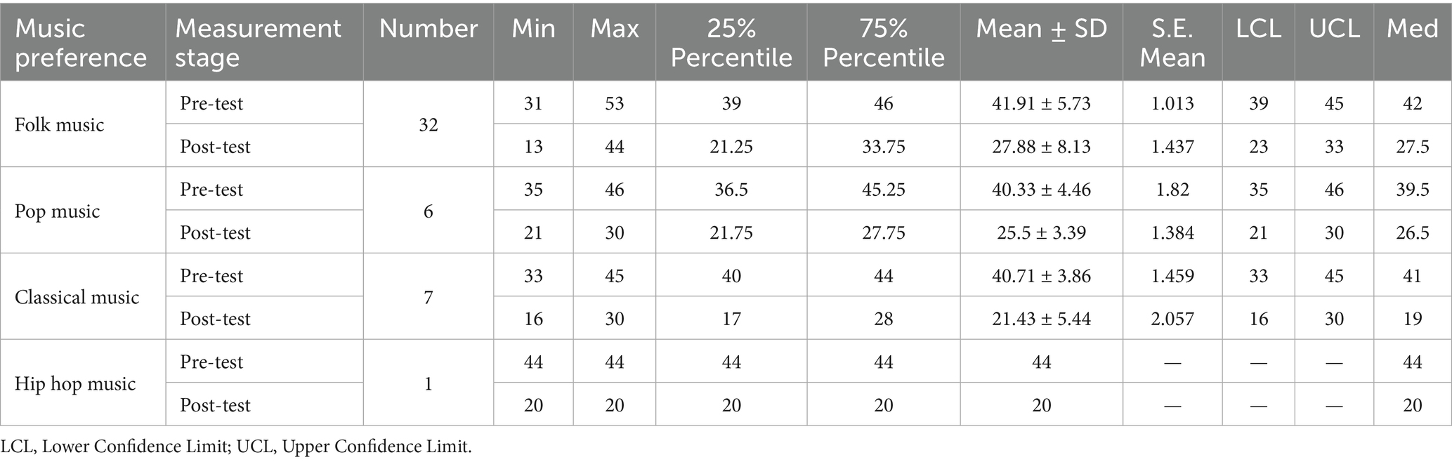 To investigate the impact of music preference on the effectiveness of resource-oriented music therapy interventions, this study analyzed the changes in stress scores before and after the intervention among participants with different musical preferences (Table 6). Participants who preferred classical music demonstrated the most significant stress reduction. Their pre-intervention mean stress score was 40.71 (SD = 3.86) with a median of 41, which significantly decreased to 21.43 (SD = 5.44) post-intervention, with a median of 19. This change was the largest among all music preference categories. In comparison, participants who preferred folk music showed a reduction from 41.91 (SD = 5.73) to 27.88 (SD = 8.13), while those who preferred pop music had their scores drop from 40.33 (SD = 4.46) to 25.5 (SD = 3.39). Only one participant preferred hip-hop music, and their stress score remained unchanged at 20 points before and after the intervention, making it difficult to draw any significant conclusions. Figure 4C further illustrates the influence of music preference on intervention outcomes, highlighting that participants who preferred classical music showed a notably greater improvement in stress relief when exposed to music that matched their personal preferences.