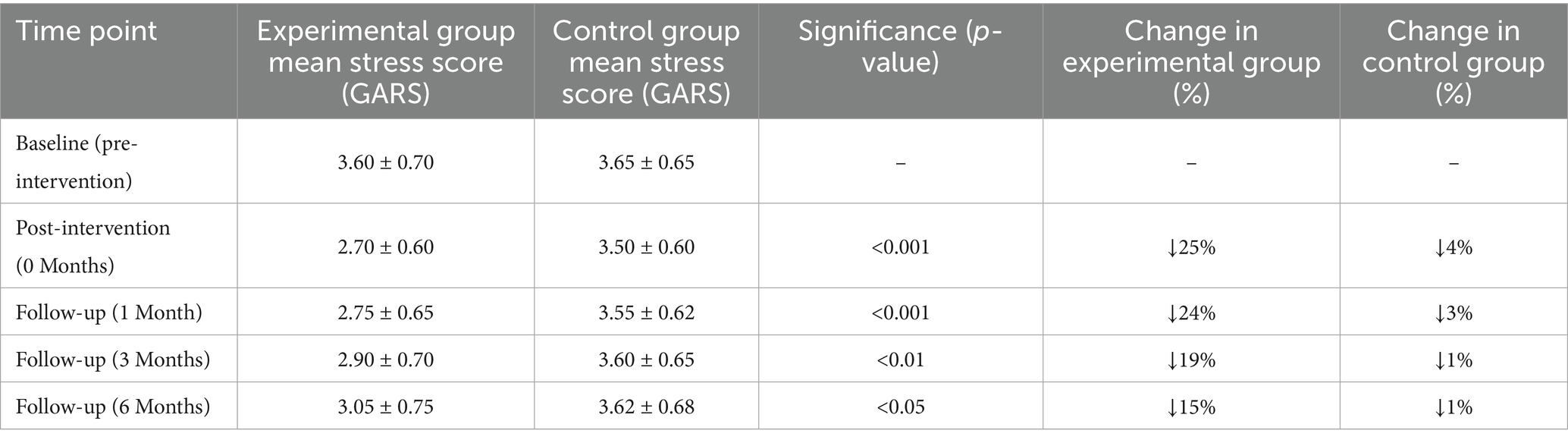 At the 1-month follow-up, the experimental group had a mean GARS score of 2.75 (SD = 0.65), slightly increasing compared to the post-intervention score of 2.70 (SD = 0.60), corresponding to a 1.85% change. The control group reported a score of 3.55 (SD = 0.62), similar to its baseline level of 3.65 (SD = 0.65). The between-group difference remained statistically significant (p < 0.001). At 3 months, the experimental group’s mean stress score increased to 2.90 (SD = 0.70), representing a 19.44% reduction from baseline. The control group scored 3.60 (SD = 0.65), nearly identical to its baseline. The between-group difference remained significant (p < 0.01). At 6 months, the experimental group had a mean stress score of 3.05 (SD = 0.75), a 15.27% reduction from baseline. The control group’s score was 3.62 (SD = 0.68), consistent with the initial measurement. Independent-sample t-tests indicated a statistically significant difference between groups at this time point (p < 0.05). All follow-up data were analyzed using complete cases without imputation for missing values.