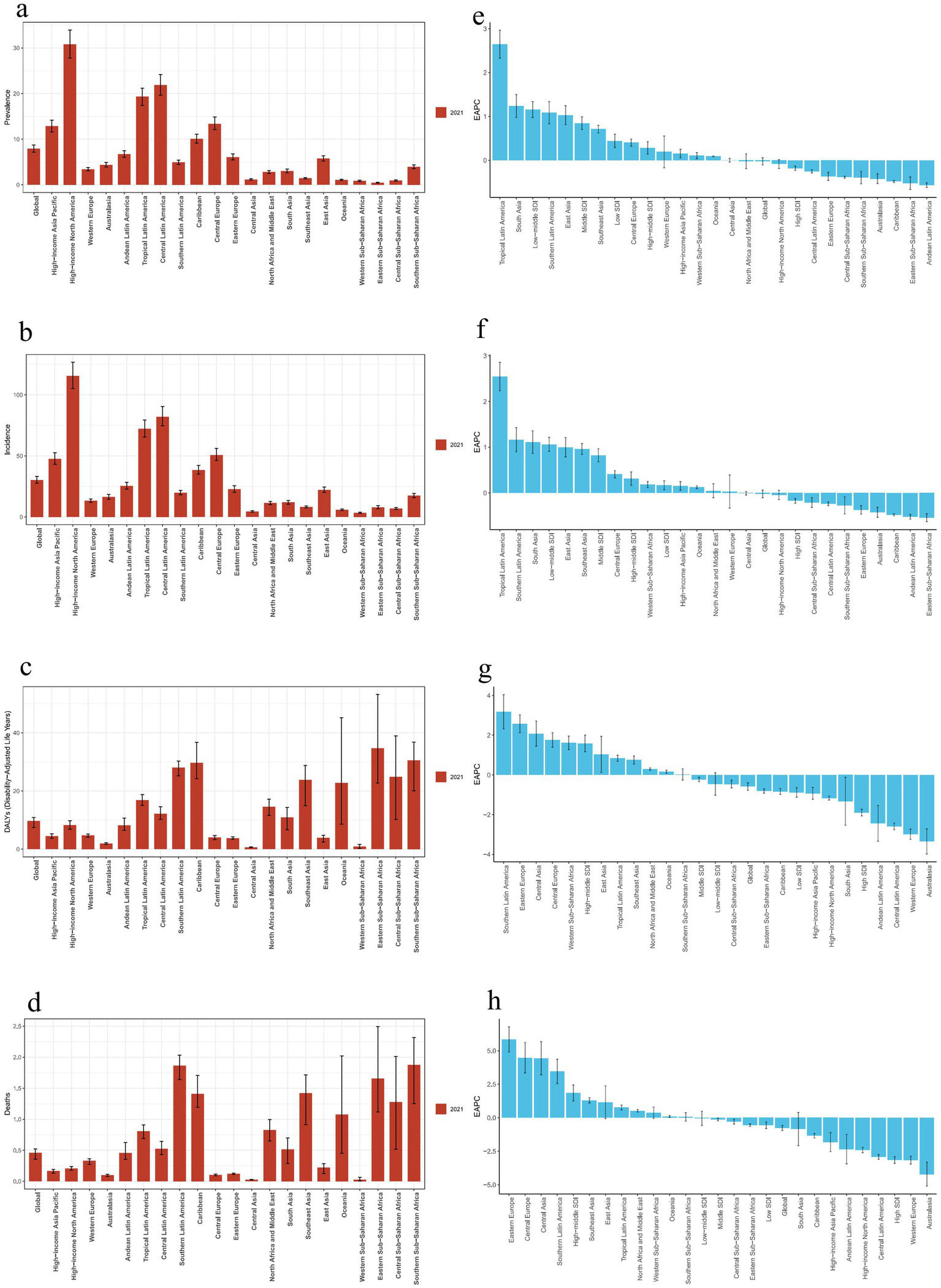 Regional disease burden trends for decubitus ulcers.(a, e): Prevalence burden and EAPC values for 21 regions.(b, f): Incidence burden and EAPC values for 21 regions. (c, g): DALY burden and EAPC values for 21 regions. (d, h): Death burden and EAPC values for 21 regions.) (EAPC, estimated annual percentage change; DALY, disability-adjusted life year).