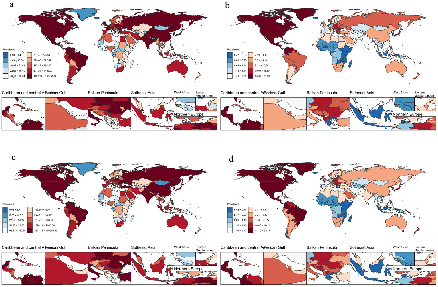 Number of cases and ASPR of decubitus ulcers (a): Number of cases of decubitus ulcers in 1990, (b): ASPR of decubitus ulcers in 1990, (c): Number of cases of decubitus ulcers in 2021, (d): ASPR of decubitus ulcers in 2021. (ASPR, age-standardized prevalence).