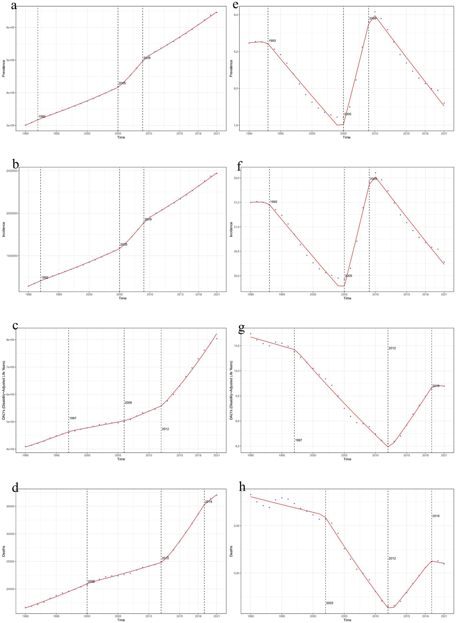 Time trends of global decubitus ulcers in 2021. (a, e): Joinpoint regression model for the number of prevalent cases and ASPR. (b, f): Joinpoint regression model for the number of incident cases and ASIR. (c, g): Joinpoint regression model for the number of DALYs and age-standardized DALY rate. (d, h): Joinpoint regression model for the number of deaths and ASDR. (ASIR, age-standardized incidence rate; ASPR, age-standardized prevalence rate; ASDR, age-standardized death rate; DALY, disability-adjusted life year).