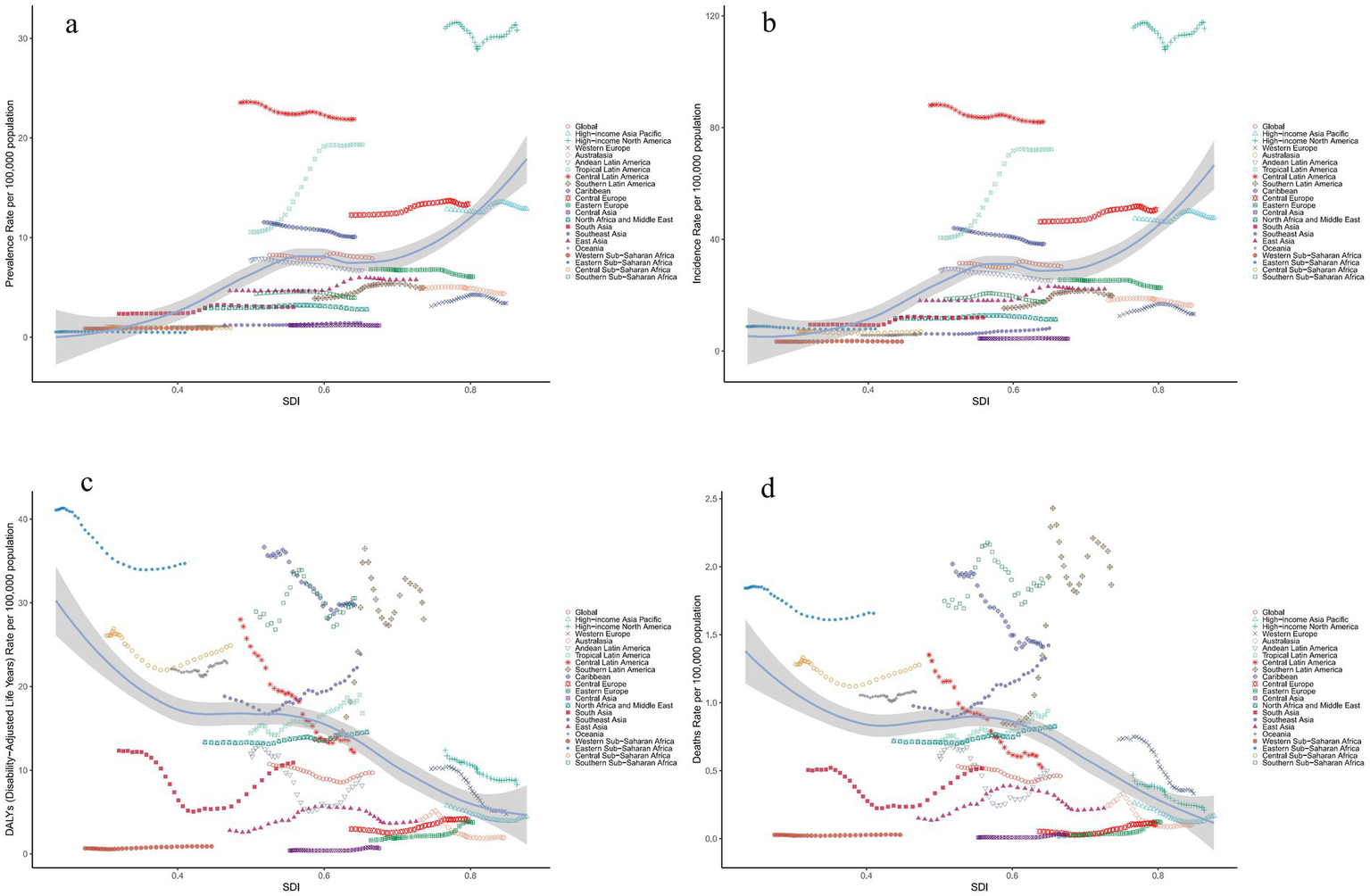 Pearson correlation analysis revealed that SDI was positively correlated with the ASPR(r = 0.6077, p < 0.01) and ASIR (r = 0.5475, p < 0.01), indicating higher rates in regions with higher SDI (Figures 5a,b). In contrast, age-standardized DALY rate (r = −0.4001, p < 0.01) and ASDR (r = −0.3706, p < 0.01) were negatively correlated with SDI, suggesting lower age-standardized DALY rate and ASDR in high-SDI regions (Figures 5c,d).
