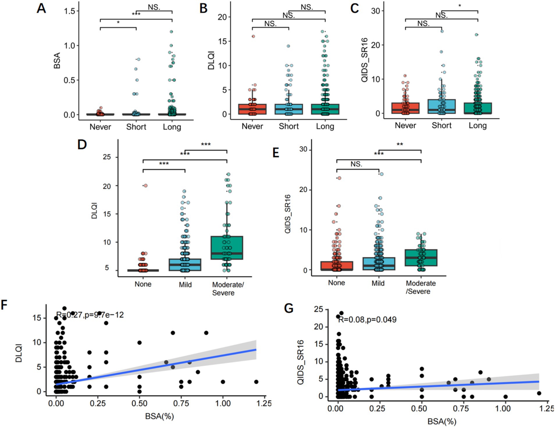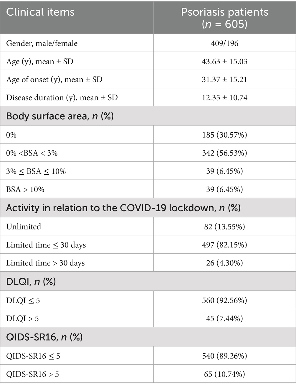 Results: A total of 963 participants were recruited, finally 605 participants were enrolled. The mean values of age and disease duration was 43.63 years, 312.35 years, 67.6% were male. Patients with disease-related impaired quality of life (DLQI > 5) accounted for 7.44%. A total of 65 patients had varying degrees of depression symptoms (QIDS-SR16 > 5 points). The result of correlation analysis revealed a positive correlation between BSA and both DLQI and QIDS-SR16 scores (R = 0.27, p < 0.001; R = 0.08, p < 0.05).