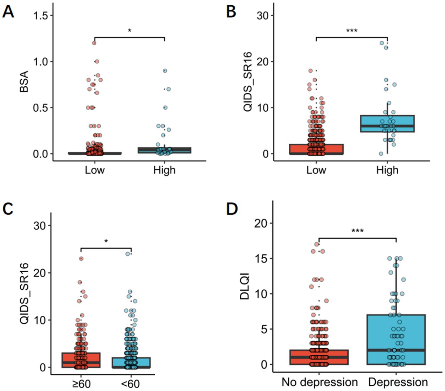 Figure 2. (A) BSA area in patients with mild psoriasis and patients with moderate to severe psoriasis. (B) QIDS-SR16 scorein patients with mild psoriasis and patients with moderate to severe psoriasis. (C) QIDS-SR16 scores in older adult (age ≥ 60) and younger groups (age < 60). (D) DLQI scores in the depression group and the non-depression group.