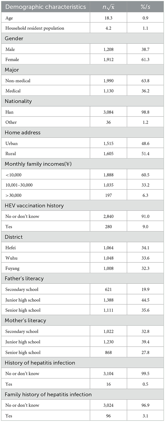 A total of 108 freshman classes (average size 30 students) across six colleges were invited. Of the 3,276 questionnaires that were collected, 3,120 were valid, with a response rate of 95.2%. 61.3% (n = 1,912) of the participants were female and 38.7% (n = 1,208) were male. The average age was (18.3 ± 0.9). 36.2% (n = 1,130) of the participants were medical students. Furthermore, 34.1% (n = 1,064) of the participants originated from Hefei, 33.6% (n = 1,048) from Wuhu and 32.3% (n = 1,008) from Fuyang. Only 9.0% (n = 280) of the participants had received hepatitis E vaccination (Table 1). 0.5% (n = 16) of the students had been infected with hepatitis, including hepatitis A (n = 5), hepatitis B (n = 12), hepatitis C (n = 2), hepatitis D (n = 1), and hepatitis E (n = 1). 3.1% (n = 96) of the students had family members infected with hepatitis, including hepatitis A (n = 5), hepatitis B (n = 90), and hepatitis C (n = 3).