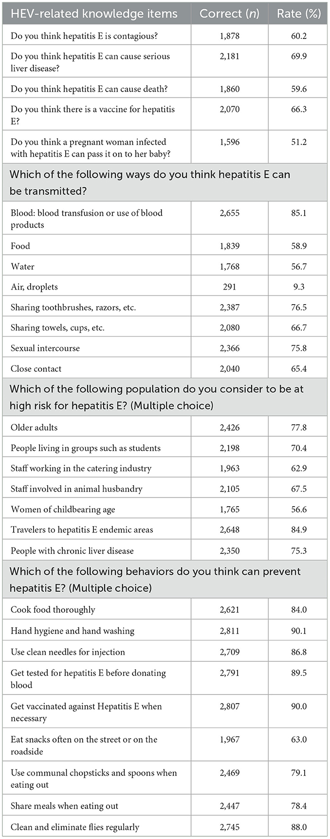 The median score for HEV-related knowledge was 12, with a range from 0 to 17. The overall knowledge rate of hepatitis E was 50.8%. Only 31.5% (n = 982) of the participants recognized what hepatitis E was; 60.2% were aware that it is contagious; 69.9% knew that it can cause serious liver disease; 59.6% knew that it can cause death; and 66.3% knew that there is a vaccination for hepatitis E. Regarding the transmission routes, the majority of students were cognizant that hepatitis E might spread through mother to child transmission (51.2%), blood (85.1%), food (58.9%), water (56.7%), sharing toothbrushes or razors (76.5%), sharing towels or cups (66.7%), sexual intercourse (75.8%), and close contact (65.4%), and merely 9.3% of the students believed that hepatitis E could be spread by droplets and air (Table 2, Supplementary file 3).