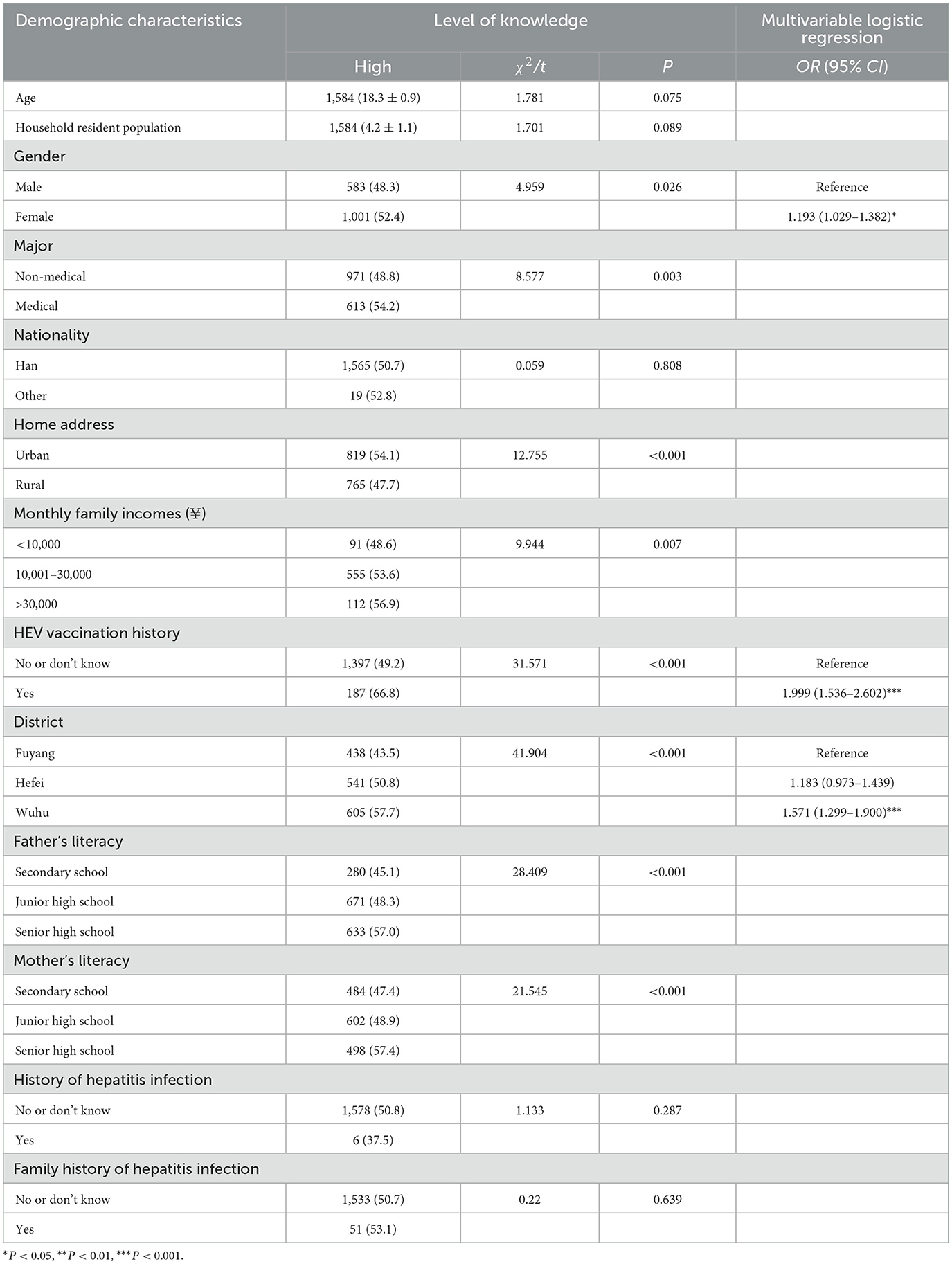 Multivariate analysis revealed that the knowledge level of HEV vaccinated students was higher (OR = 1.999, 95% CI: 1.536–2.602) compared to non-vaccinated students. Furthermore, female students (OR = 1.193, 95%CI: 1.029–1.382) and students from Wuhu (OR = 1.571, 95% CI: 1.299–1.900) had significantly higher level of HEV-related knowledge (Table 3).