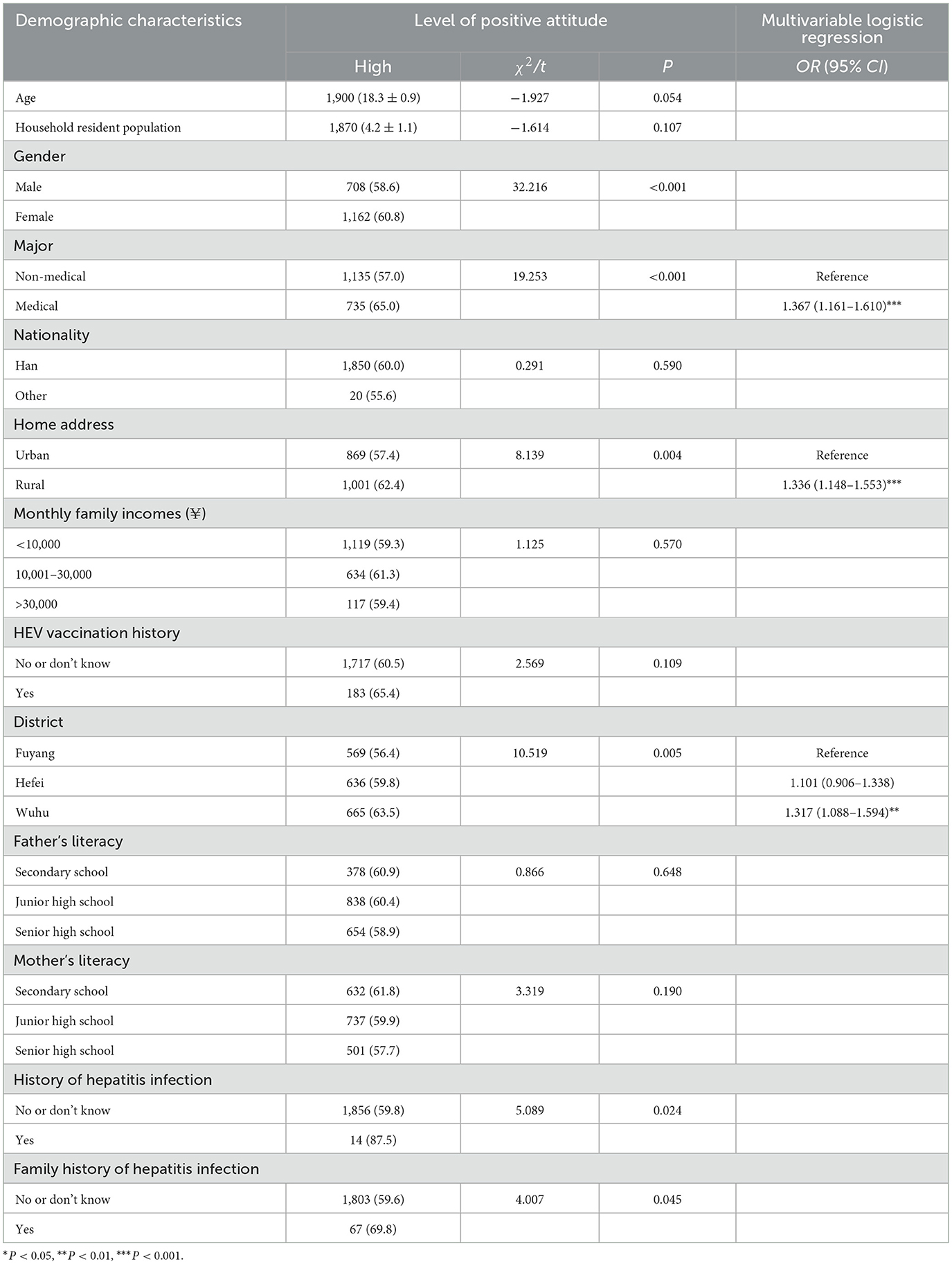 Table 4 summarizes multivariate analyses of factors associated with a positive attitude toward HEV. Compared to non-medical students, the positive attitude level of medical students was higher (OR = 1.367, 95% CI: 1.161–1.610). Students from rural (OR = 1.336, 95% CI: 1.148–1.553) and Wuhu (OR = 1.317, 95% CI: 1.088–1.594) had higher level of positive attitude toward HEV.
