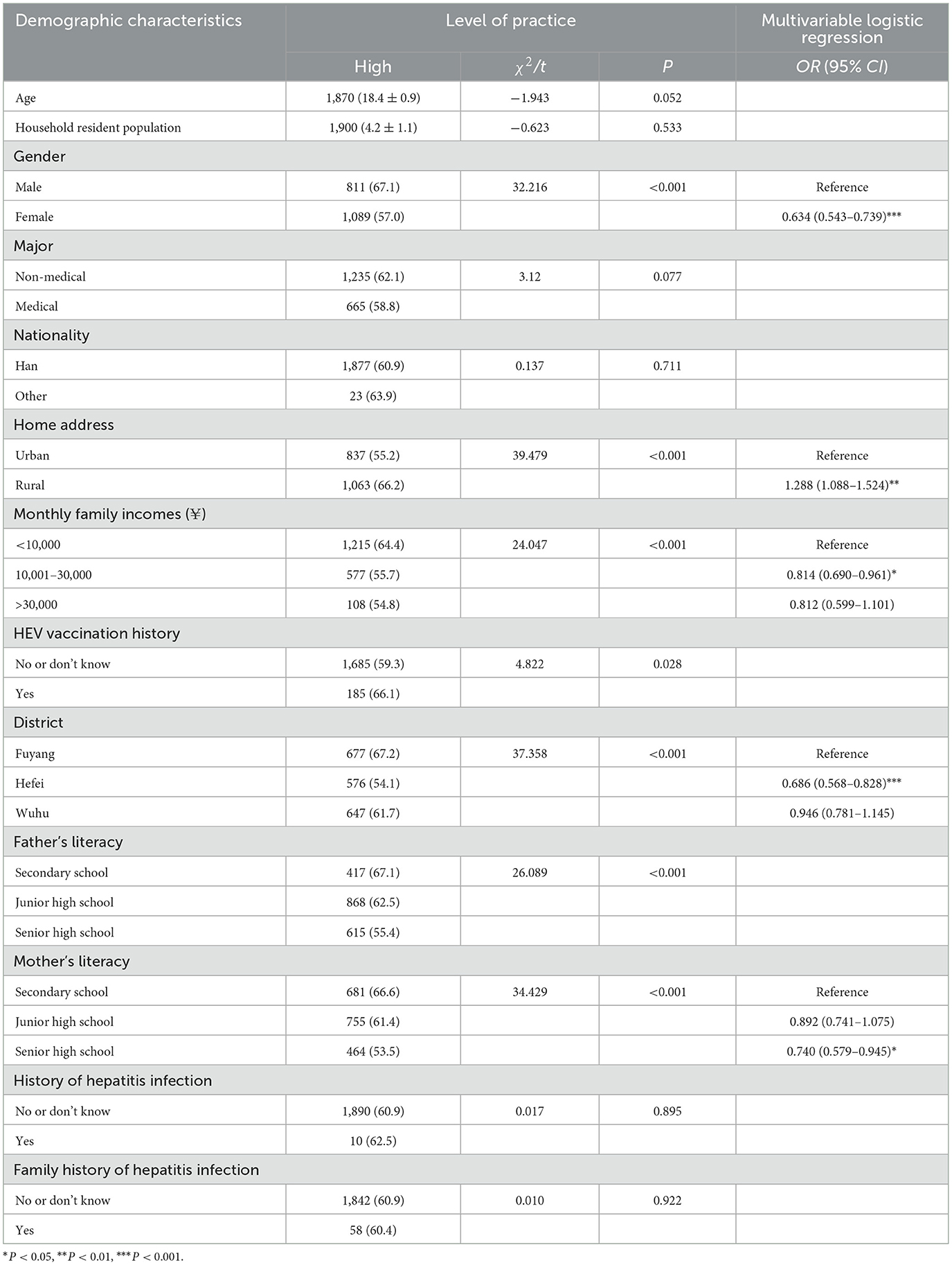 Table 5 summarizes multivariate analyses of the factors of health practice associated with HEV. Compared to urban students, the health practice level of rural students was higher (OR = 1.288, 95% CI: 1.088–1.524).