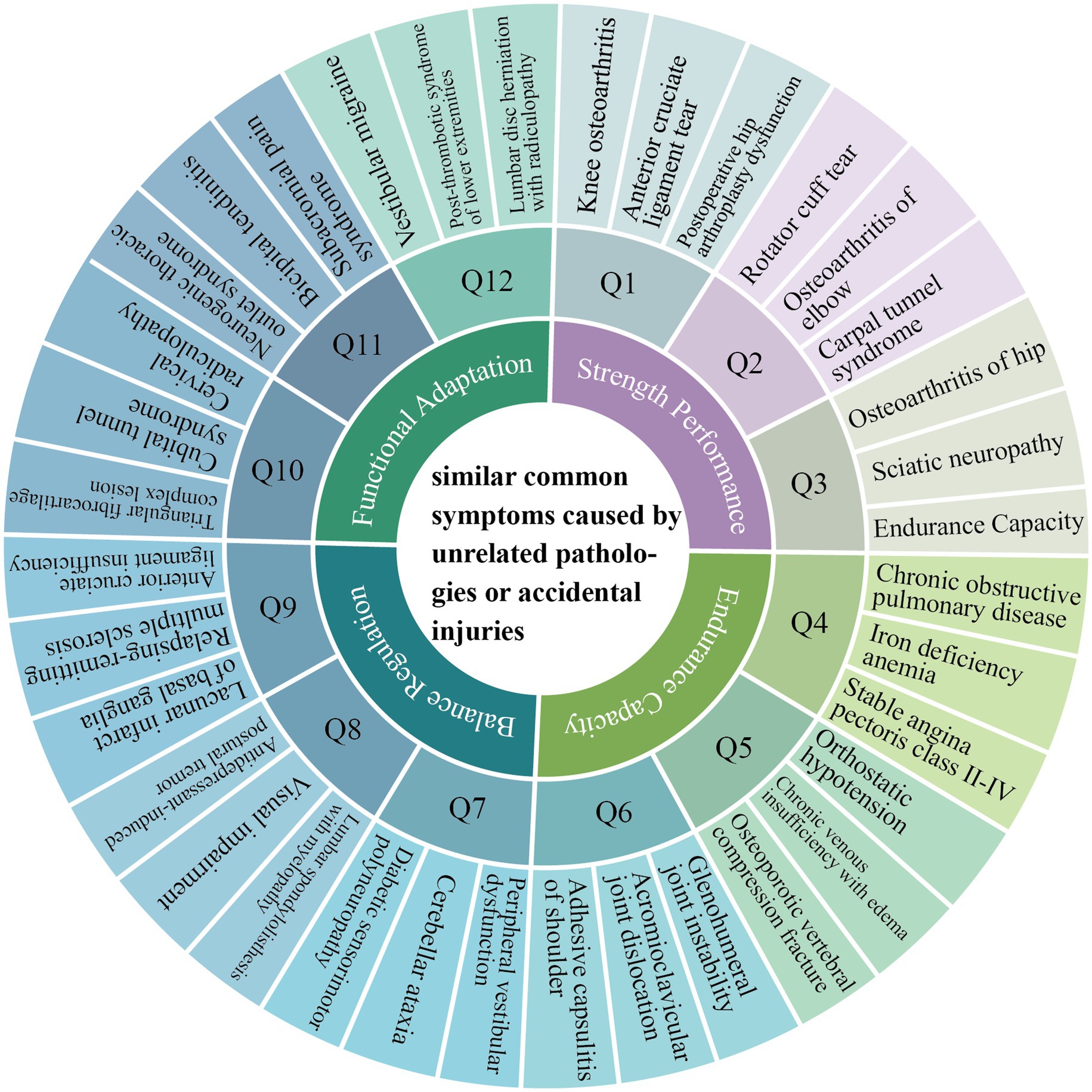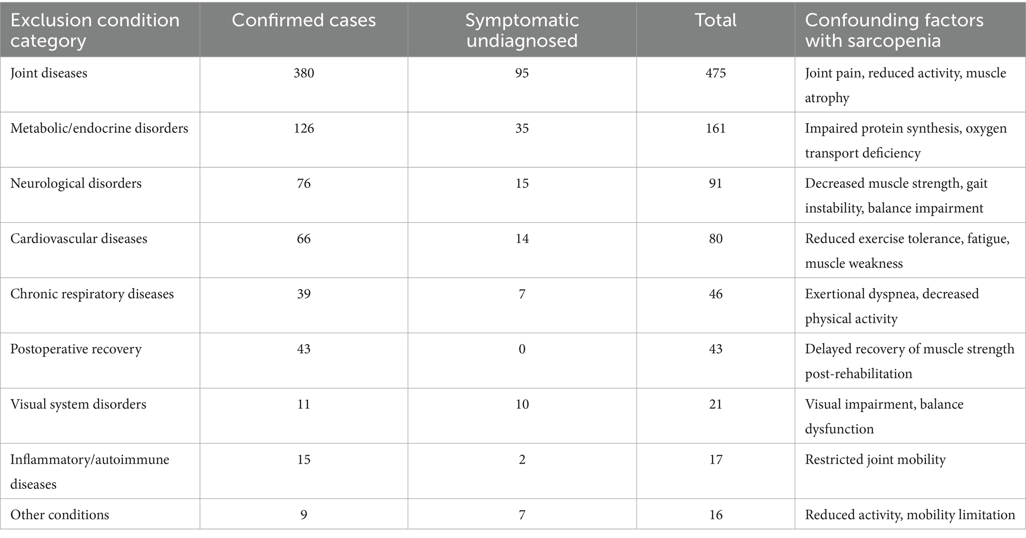 As systematically tabulated in Table 3, our exclusion criteria specifically targeted pathologies capable of mimicking sarcopenic phenotypes through three primary mechanistic pathways: mechanical interference from joint diseases (n = 475) inducing joint pain, reduced activity, muscle atrophy (31); metabolic interference arose predominantly from endocrine conditions (n = 161) disrupting essential protein anabolism pathway and oxygen transport deficiency; while neurological confounding in relevant disorders (n = 91) manifesting clinically significant strength and balance deficits (32). Additionally, the “Other conditions” category (n = 16) encompassed clinically relevant transient states including activity-induced myalgia, exemplified by reports of generalized soreness following prolonged childcare, and traumatic mobility limitations such as those described in cases of recent ankle injury significantly limiting ambulation capacity.