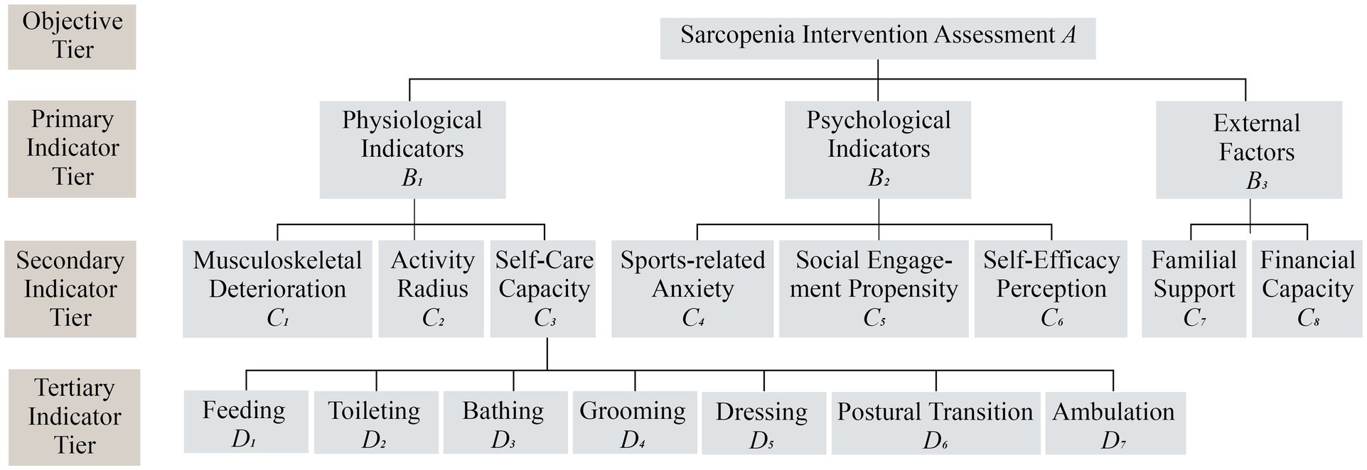Building upon the Analytic Hierarchy Process (AHP) framework, we established a stratified evaluation system comprising three primary indicator strata which are physiological, psychological, and external factors, they were further subdivided into nine secondary indicators and seven tertiary indicators (Figure 2). Weight allocations integrated expert evaluations from 10 specialists at the Third Affiliated Hospital of Fujian University of Traditional Chinese Medicine with functional independence metrics derived from the Activities of Daily Living (ADL) scale, a clinically validated tool particularly relevant for sarcopenia assessment, given that sarcopenia doubles ADL disability risk in older adults populations (33).