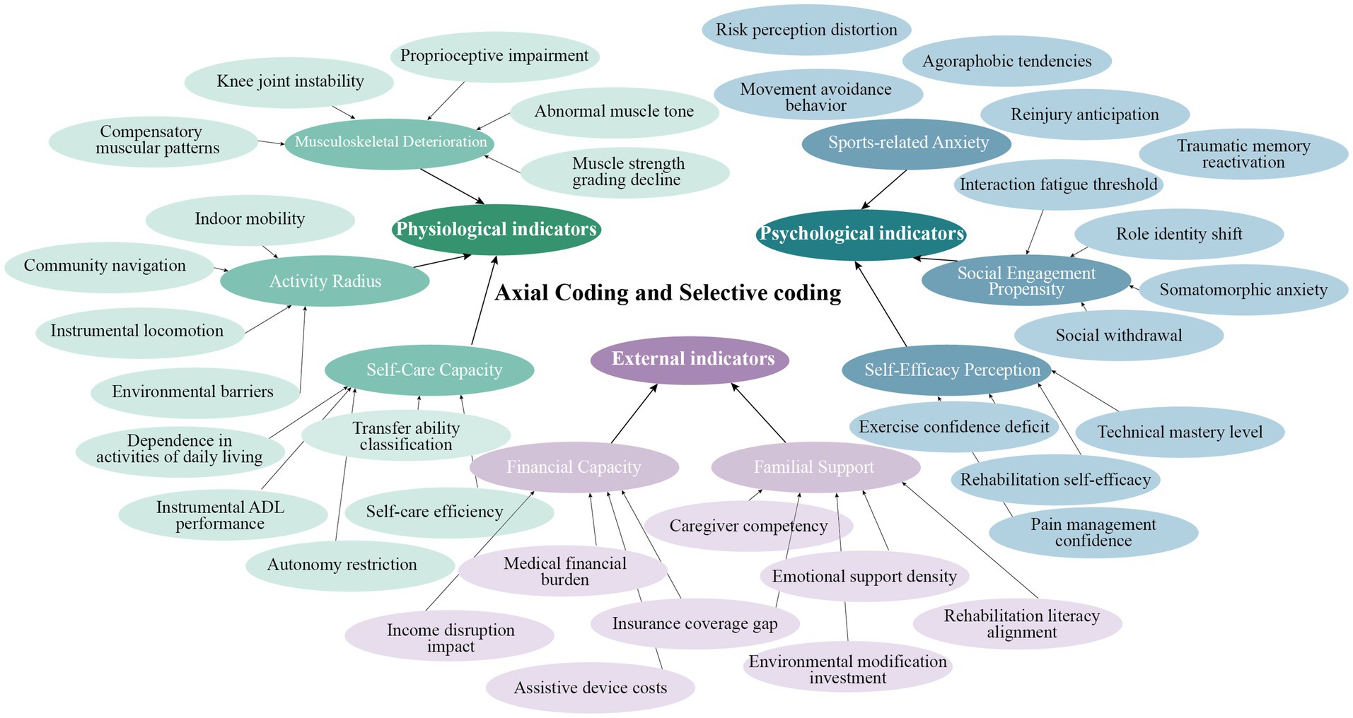 Open coding identified 68 initial concepts through line-by-line annotation, generating nodes like “Decline in knee joint stability” and “Increased dependency in activities of daily living (ADL)” (Supplementary Table S3). Axial coding established relational hierarchies using NVivo’s matrix coding, linking categories, such as connecting “proprioceptive impairment” to “agoraphobic tendencies” through causal chains. Selective coding systematically integrated three core dimensions: physiological (musculoskeletal degeneration, activity radius, self-care capacity); psychological (Sports-related anxieties, self-efficacy perception and social engagement propensity); external (financial capacity and familial support) (Figure 3). This iterative process synthesized a tripartite framework elucidating dynamic interactions among physiological, psychological, and social determinants in the progression of sarcopenia among aging populations.