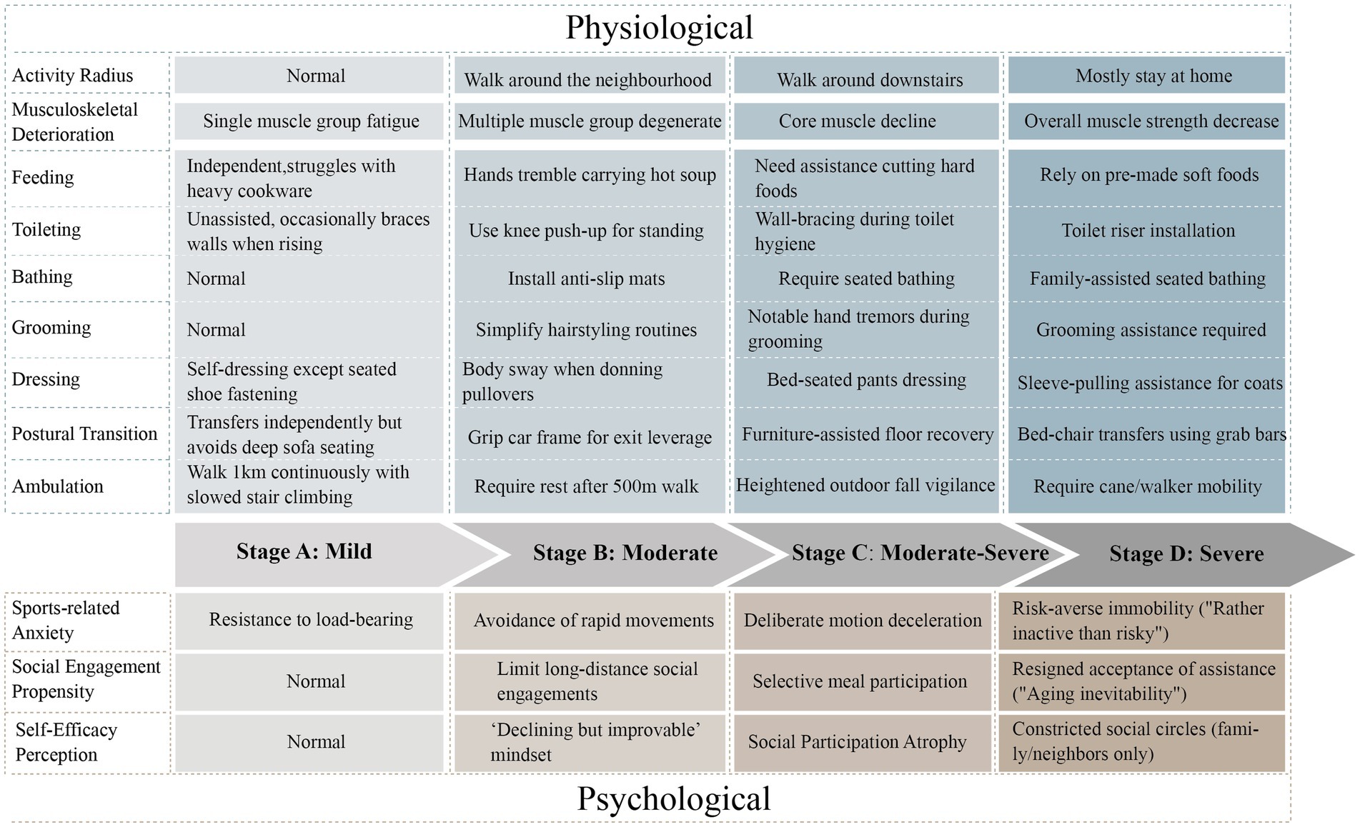 From the synthesized interview data, we categorized the target population into four clinically distinct progression stages (Figure 4). Stage A mild is defined as the Functional Compensation Phase characterized by an unrestricted mobility range complete independence in basic Activities of Daily Living and the presence of single muscle group fatigue manifestations such as difficulty lifting heavy objects with psychological features showing no movement avoidance behavior and normal social participation as captured in interview quotes occasionally tired but recovers quickly. Stage B moderate is defined as the Functional Compensation Attenuation Phase characterized by a mobility range reduced to the community level instrumental Activities of Daily Living requiring adaptive strategies like simplifying household chores and signs of multi-muscle group functional decline such as hand tremors while holding a bowl with psychological features revealing situational movement anxiety and selective engagement in social activities reflected in interview quotes choosing only flat paths when going out. Stage C moderate to severe is defined as the Functional Decompensation Phase characterized by a mobility range confined to the vicinity of the residence basic Activities of Daily Living requiring partial assistance such as help with chopping vegetables and signs of core muscle group deterioration such as needing to brace against walls when standing with psychological features indicating persistent movement fear and active social withdrawal evident in interview quotes afraid of falling avoids going out. Stage D severe is defined as the Functional Dependence Phase characterized by mobility restricted within the home dependence on assistance for basic Activities of Daily Living such as requiring accompaniment during bathing and signs of systemic muscle strength loss such as needing support to stand with psychological features demonstrating movement behavioral freezing and social circle collapse as expressed in interview quotes sitting feels safest. The staging framework fundamentally constitutes a clinical behavioral classification system.