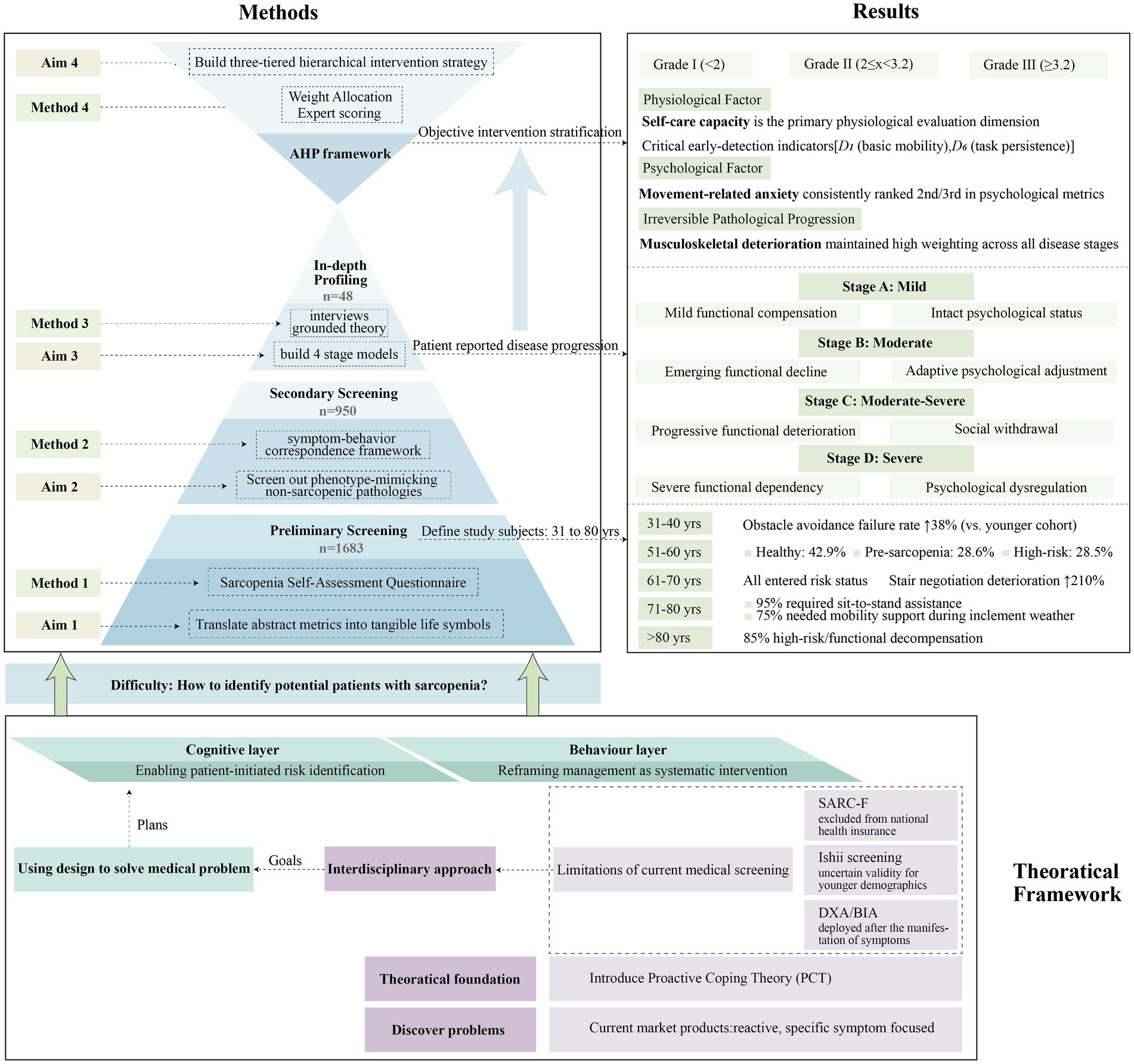 Section 2.1 evidences lower adoption rates of sarcopenia interventions in rural areas versus urban settings, coupled with elevated sarcopenia risk among urban older adults. This urban–rural dichotomy reveals systemic healthcare inequities in aging populations, necessitating interdisciplinary, design-driven solutions. To maximize accessibility and diffusion potential, our strategy prioritizes older adults residents in China’s first and second-tier1 cities as primary research samples and initial beneficiaries. Future rural scalability is anticipated through reverse migration patterns of urban workers returning to hometowns.