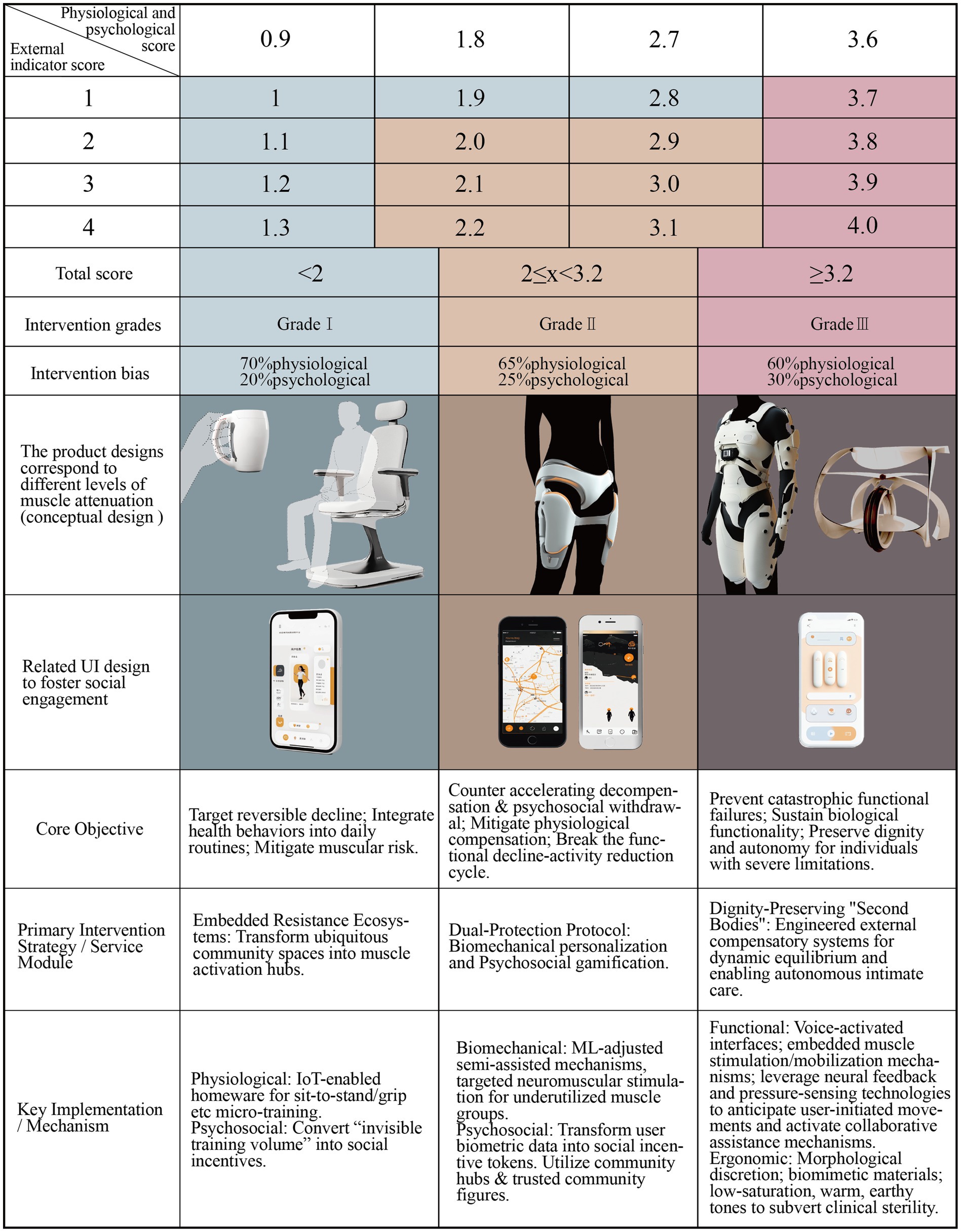 Grade I interventions were recommended for scores of less than 2, targets reversible decline through muscular risk mitigation; Grade II interventions were applied to scores of between 2 and 3.2, counters accelerating decompensation and psychosocial withdrawal; and Grade III interventions corresponded to scores of over 3.2, prevents catastrophic failures in balance and psychosomatic function. The final composite scores, intervention tiers, and corresponding product design specifications are shown in Figure 6.