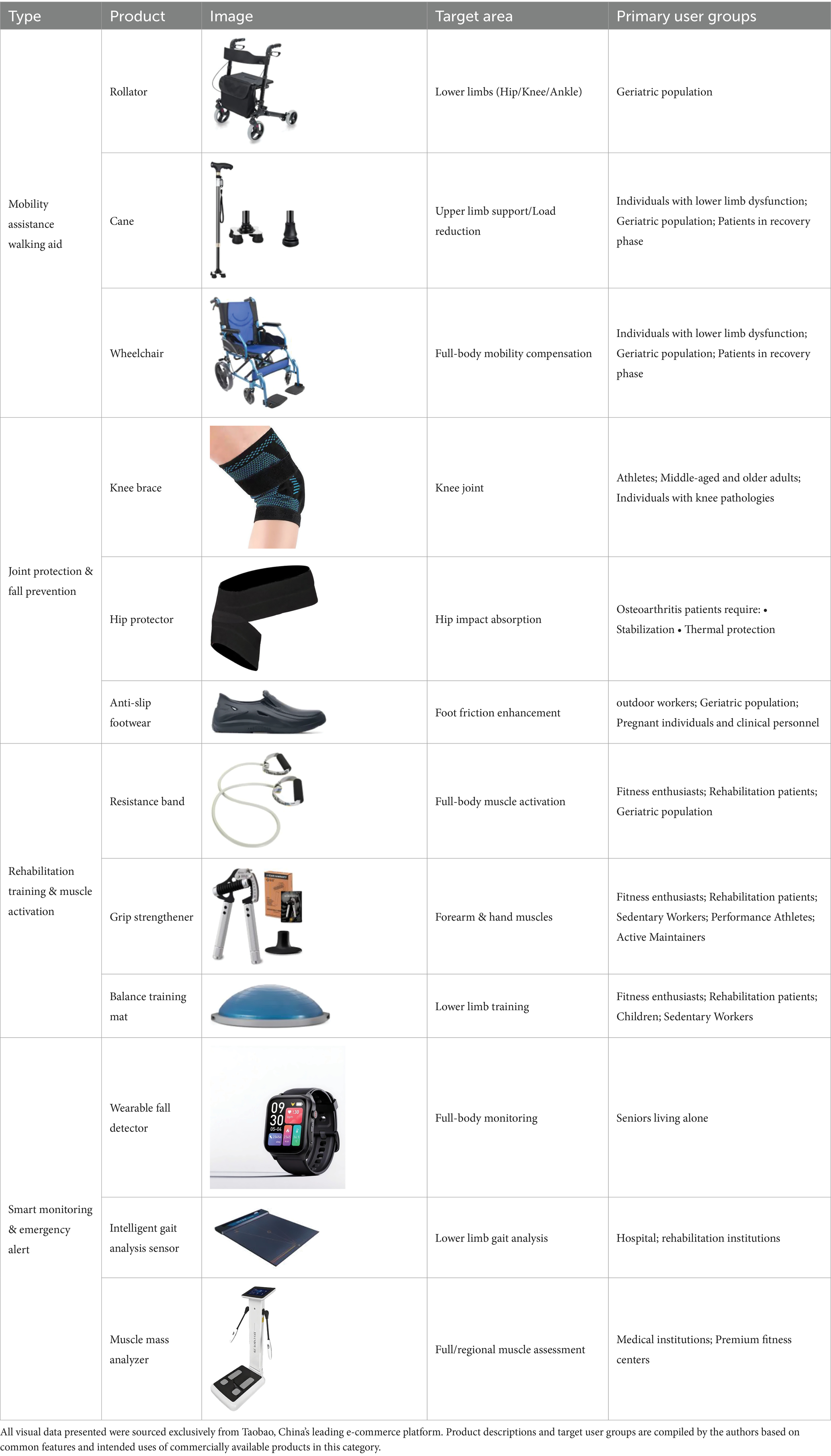 We cataloged commercially available sarcopenia related products to establish the current market landscape. Existing evidence indicates that rural older adults exhibit markedly lower adoption rates of existing assistive products (11) shown in Table 1 (excluding canes) due to constrained educational attainment and economic constraints (12). These factors collectively impede the uptake of both conventional and innovative interventions in rural settings. Conversely, research suggests a contrasting functional profile: sustained engagement in agricultural activities preserves rural elders’ physical autonomy (13), whereas urban counterparts, despite greater nutritional diversity, face elevated disability risks associated with dietary patterns, exhibit excessive intake of high-processed foods correlating with health risk (14).
