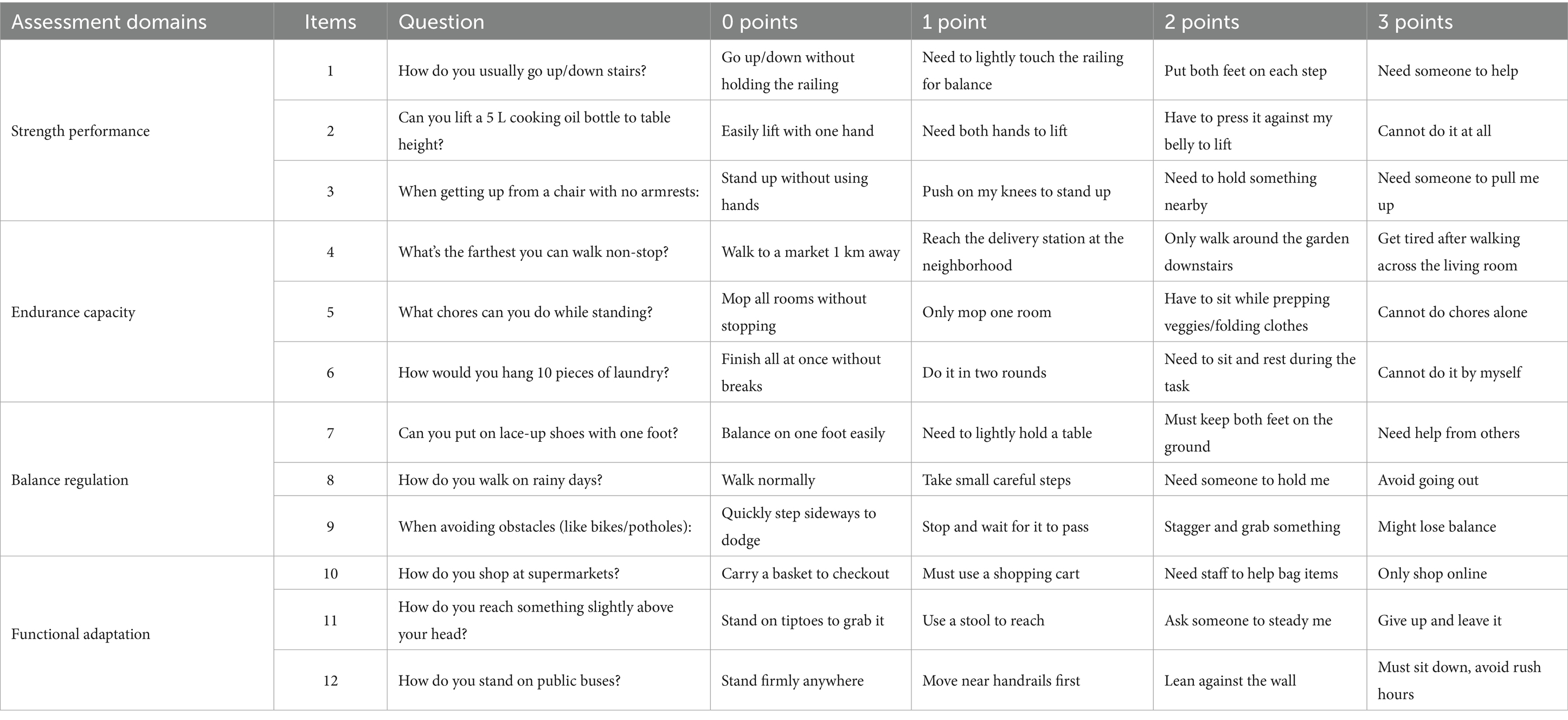 Having established this urban-focused cohort, we implemented a culturally-adapted preliminary screening protocol to identify sarcopenia risk trajectories. The Sarcopenia Self-Assessment Questionnaire shown in Table 2 translates abstract metrics into tangible life symbols in China. For example, it replaces “5 kg” with oil-lifting tests that establish mass-muscle correlations and it conceptualizes walking distances using “market–delivery station” and “residential complex-living room” spatial analogies. This lifestyle-embedded screening mechanism enables early non-clinical detection via self-assessed physical performance. The scale categorizes 0–8 points as “Healthy,” 9–16 points as “Pre-Sarcopenia Compensation,” 17–24 points as “High Risk,” and ≥ 25 points as “Disabling Degeneration.” Questionnaires were disseminated through traceable community networks, encompassing both digital and physical channels.