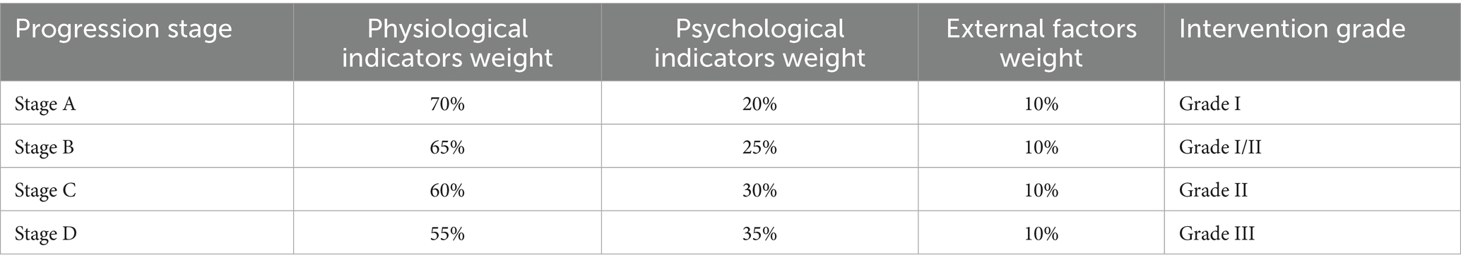 Informed by our empirical findings, we developed a dynamic weight-shifting evaluation model (Table 5), in which Grade I interventions are dominated by physiological indicators (70% weighting) and as interventions escalate to Grade III, psychological metrics gain progressively higher priorities. Based on this framework and expert input through pairwise comparisons, we constructed the underlying judgment matrices. The consistency of these expert judgments was rigorously validated, with results shown in Supplementary Table S6. All consistency ratios (CR) were below 0.1, confirming the reliability of the expert inputs. Subsequently, integrating the validated judgments with the dynamic weighting framework, we derived the finalized, intervention-grade-specific weight sets, shown in Table 6.