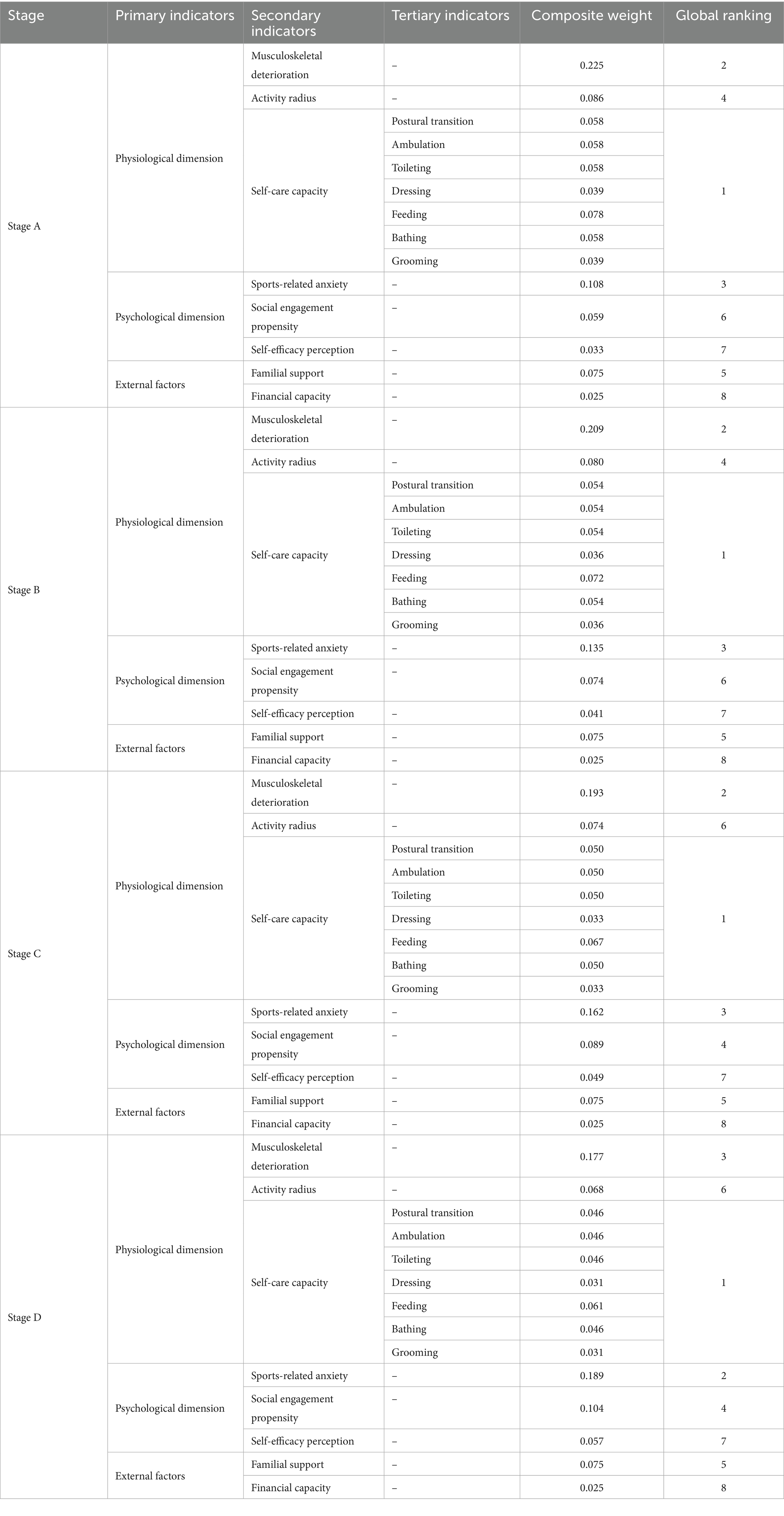 Finally, AHP analysis was executed via Expert Choice 11.0 software. The hierarchical framework for sarcopenia intervention stratification was first constructed in the software’s Hierarchy Editor module. Subsequently, the judgment matrices from 10 experts were input level-by-level through the Judgment Matrix interface. The critical consistency validation phase was automatically executed by the system which aggregated expert data using the geometric mean method while calculating the Consistency Ratio (CR) for each hierarchy in real-time. To accommodate dynamic weighting requirements, four disease stage (A-D) were established in the Scenario Manager module. In Stage A, physiological factors were locked at 70% weighting priority. As scenarios progressed toward Stage D, psychological factors were incrementally prioritized, resulting in the weighting coefficient for exercise anxiety increasing from 0.108 to 0.189. Table 6 outputs the global weighting ranking of tertiary indicators, and documents coefficient variations across stages. The exported data was then embedded into the Latex algorithm to calculate intervention grades (I-III).