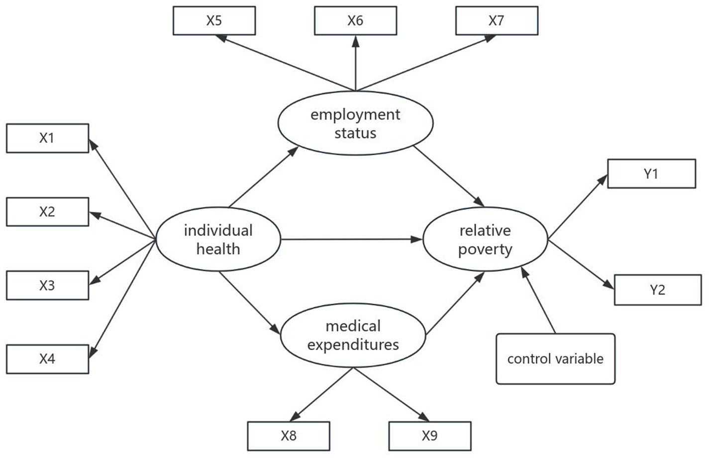 This study employs structural equation modeling (SEM) to examine the relationships between observed indicators and latent constructs while investigating the interrelationships among latent variables. The model specifically elucidates the pathway mechanisms through which individual health influences relative poverty status. SEM is selected for its capacity to integrate confirmatory factor analysis with path modeling, thereby enabling simultaneous estimation of multidimensional health impacts that operate as both latent determinants and mediating mechanisms, while rigorously controlling for measurement errors.