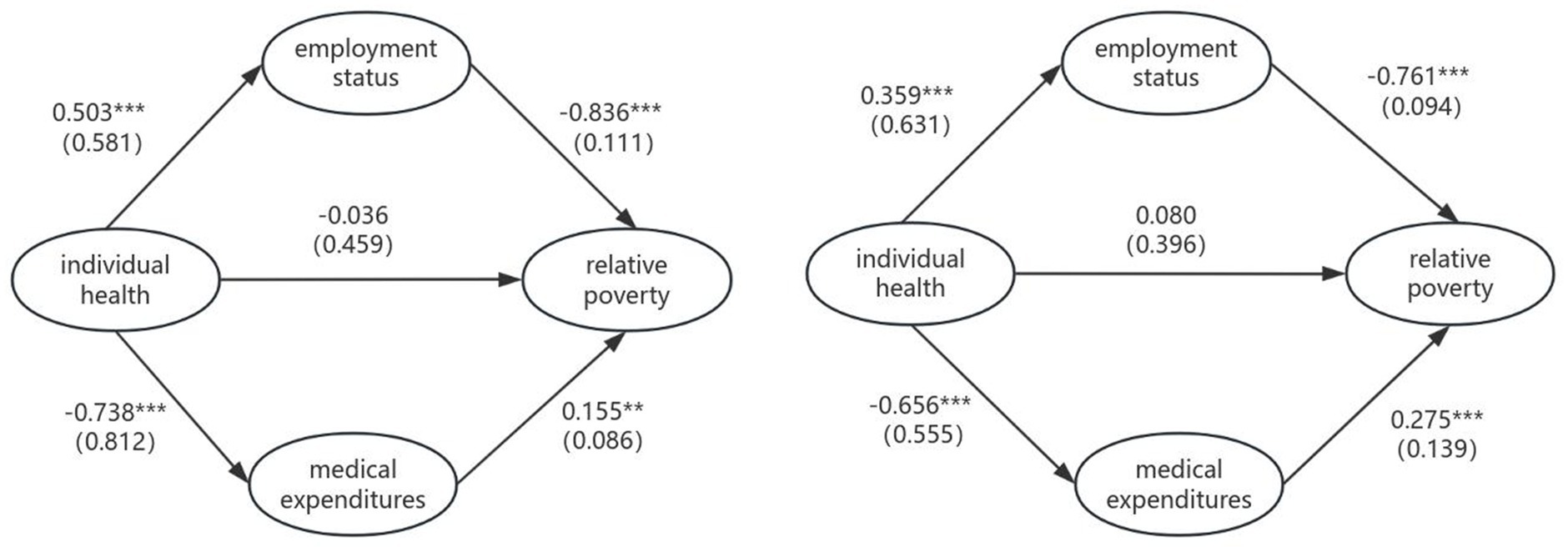 Under covariate control, the magnitude (absolute value) of the standardized coefficient indicates the strength of the relationship between the variables and the sign indicates the direction of the relationship. Under the control of covariates, the standardized coefficient between health status and employment status was 0.389, while the standardized coefficient with relative poverty was −0.796. This indicates that improved health conditions enhance individuals’ income-generating capacity, thereby alleviating poverty. Simultaneously, the coefficient between health status and medical expenditure was −0.730, while medical expenditure showed a positive correlation coefficient of 0.184 with poverty. These findings demonstrate that health improvements can reduce medical expenditures and help prevent individuals from falling into relative poverty. The research results suggest that personal health status primarily affects relative poverty through employment status and medical expenditures.