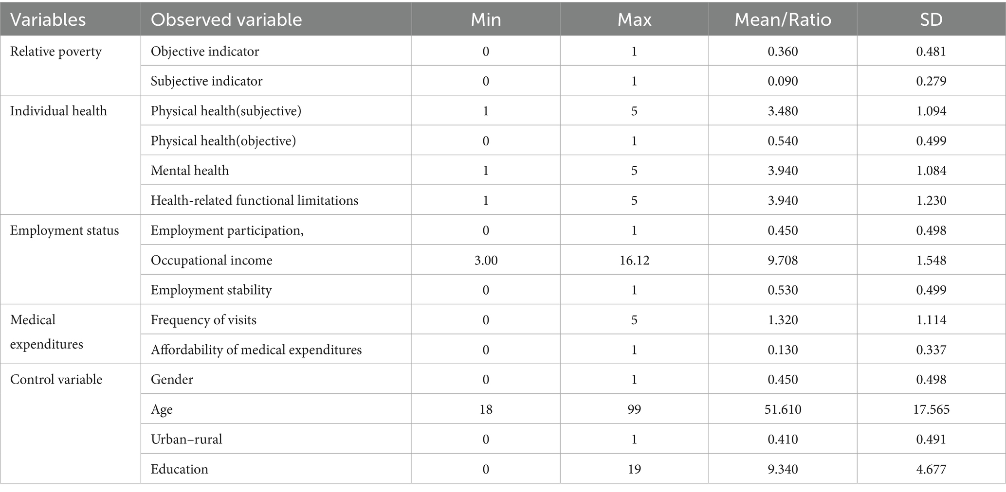 To achieve operationalization of relative poverty through objective indicators, an income threshold set at 50% of the median income was adopted, aligning with the OECD’s comparative poverty standard. For subjective measurement, drawing on Rojas’ (22) concept of economic deprivation perception, we employed the following approach: Respondents who “consider themselves far below average” were coded as 1 (indicating relative poverty status), while others were coded as 0. Crucially, chi-square test results revealed a statistically significant association between objective poverty indicators and subjective poverty perception (p < 0.001). This finding strongly supports the complementary nature of both measurement approaches in characterizing relative poverty, consequently validating the rationale for their integrated analysis.