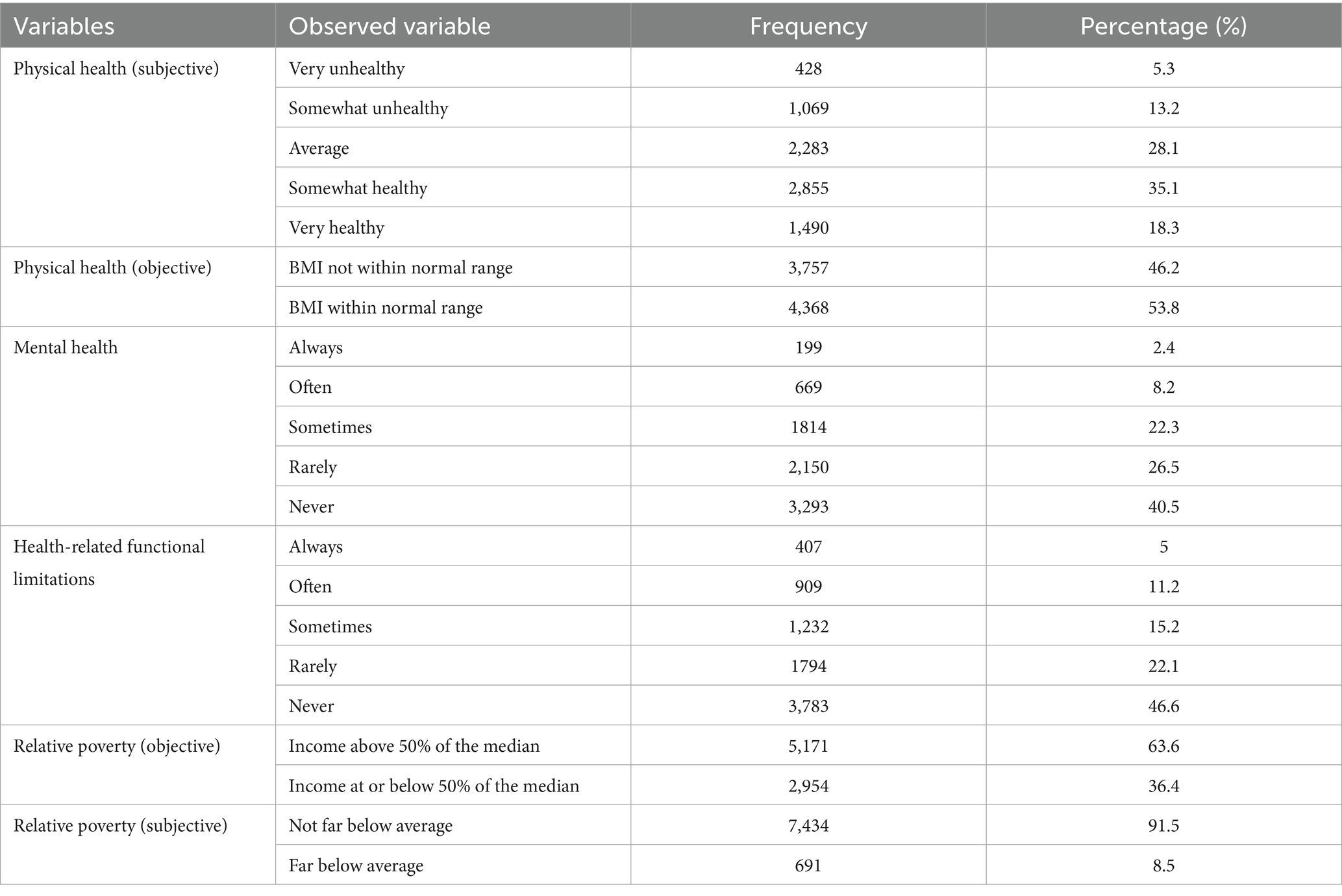 To investigate the impact of individual health on relative poverty and explore the pathways through which health influences relative poverty, we implemented the following data processing procedures. First, we employed multiple imputation methods to address missing values. This approach maximizes data completeness while ensuring compatibility with structural equation modeling requirements. After multiple imputations, we obtained five data subsets and selected the optimal subset based on the principles of rationality and optimality. Subsequently, we excluded observations with persistent missing values post-imputation to enhance analytical robustness. Through these two processing steps, we ultimately obtained 8,125 analytical samples. These samples demonstrate broad representativeness and can accurately reflect the actual conditions of Chinese society, making their use in this study both methodologically sound and empirically valid.
