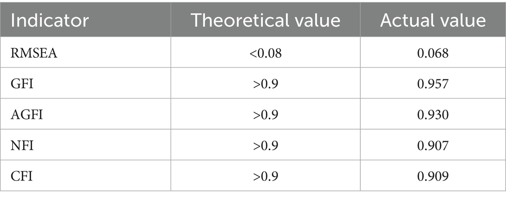 The overall model fit was evaluated using established indices recommended by Marsh et al. (24), including the Root Mean Square Error of Approximation (RMSEA), Goodness-of-Fit Index (GFI), Adjusted Goodness-of-Fit Index (AGFI), Normed Fit Index (NFI), and Comparative Fit Index (CFI). Interpretation criteria were applied as follows: An RMSEA value below 0.05 indicates excellent model fit, while values between 0.05 and 0.08 suggest acceptable fit. GFI and AGFI values exceeding 0.9 demonstrate strong alignment between the model and empirical data, reflecting the model’s capacity to effectively explain observed patterns. Similarly, NFI and CFI values greater than 0.9 (with values approaching 1.0) signify superior model fit, indicating enhanced consistency between the hypothesized model and actual data.