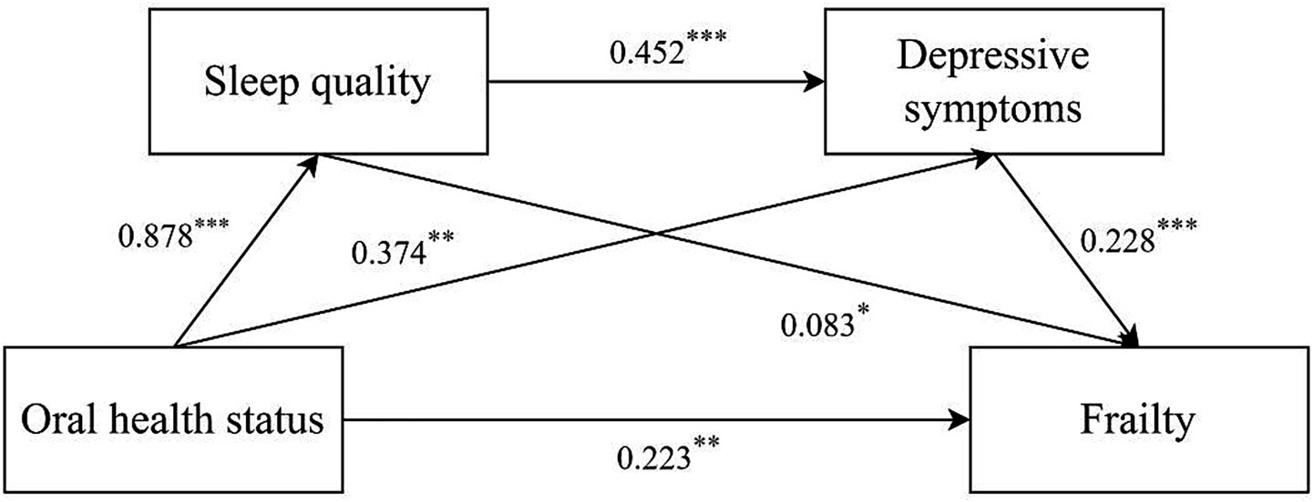 Figure 1. Mediating effect analysis of sleep quality/depressive symptoms between oral health status and frailty. *p < 0.05; **p < 0.01; ***p < 0.001.