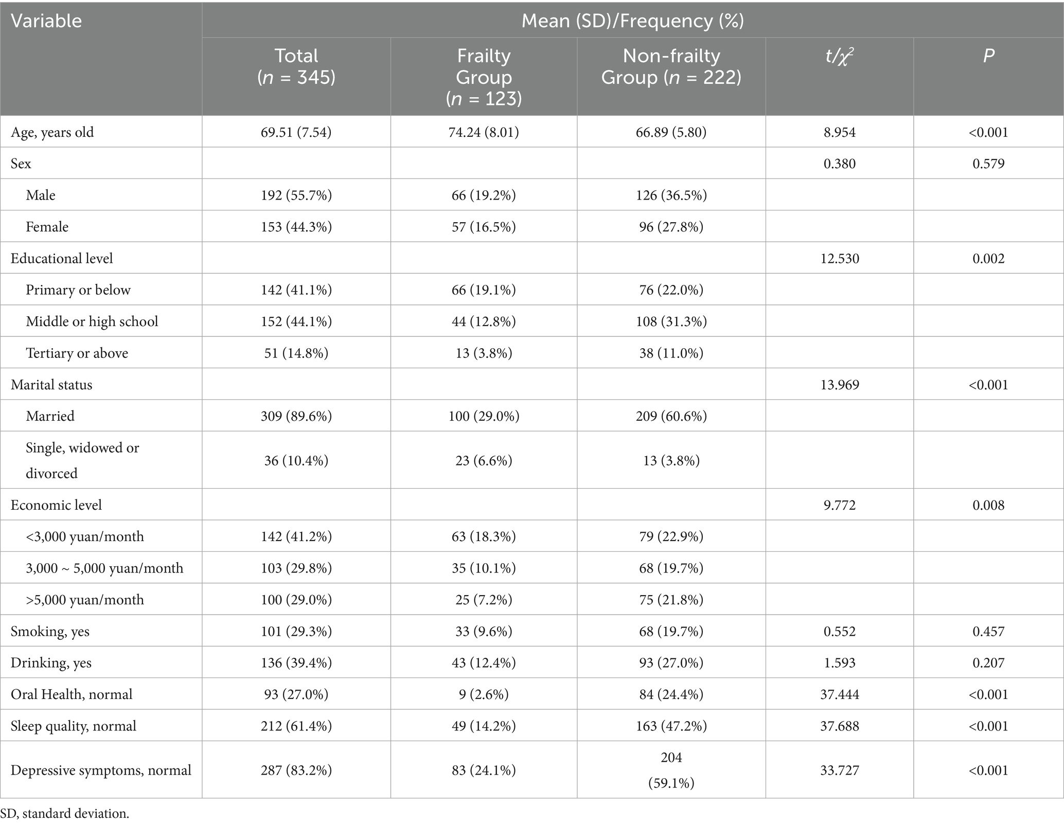 The global population is aging rapidly, particularly in China. By late 2023, individuals aged ≥ 60 years accounted for 21.2% of the population (1). According to United Nations standards, China has officially entered a moderately aging society, posing major socio-economic challenges (2). Frailty is a common geriatric syndrome, resulting from multisystem functional decline and reduced stress resilience. This leads to physiological, psychological, and social changes, heightening risks for depressive symptoms, dependency, disability and premature mortality (3). Consequently, frailty raises familial caregiving burdens and strains healthcare resources, making it a public health priority (4).