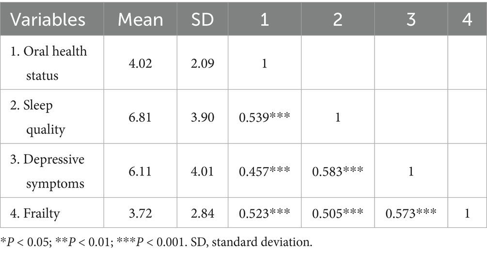 Pearson correlation analysis (Table 2) shows that oral health status was positively correlated with sleep quality (r = 0.539, p < 0.001), depressive symptoms (r = 0.457, p < 0.001), and frailty (r = 0.523, p < 0.001). Also, sleep quality was positively correlated with depressive symptoms (r = 0.583, p < 0.001) and frailty (r = 0.505, p < 0.001). Depressive symptoms was positively correlated with frailty (r = 0.573, p < 0.001).